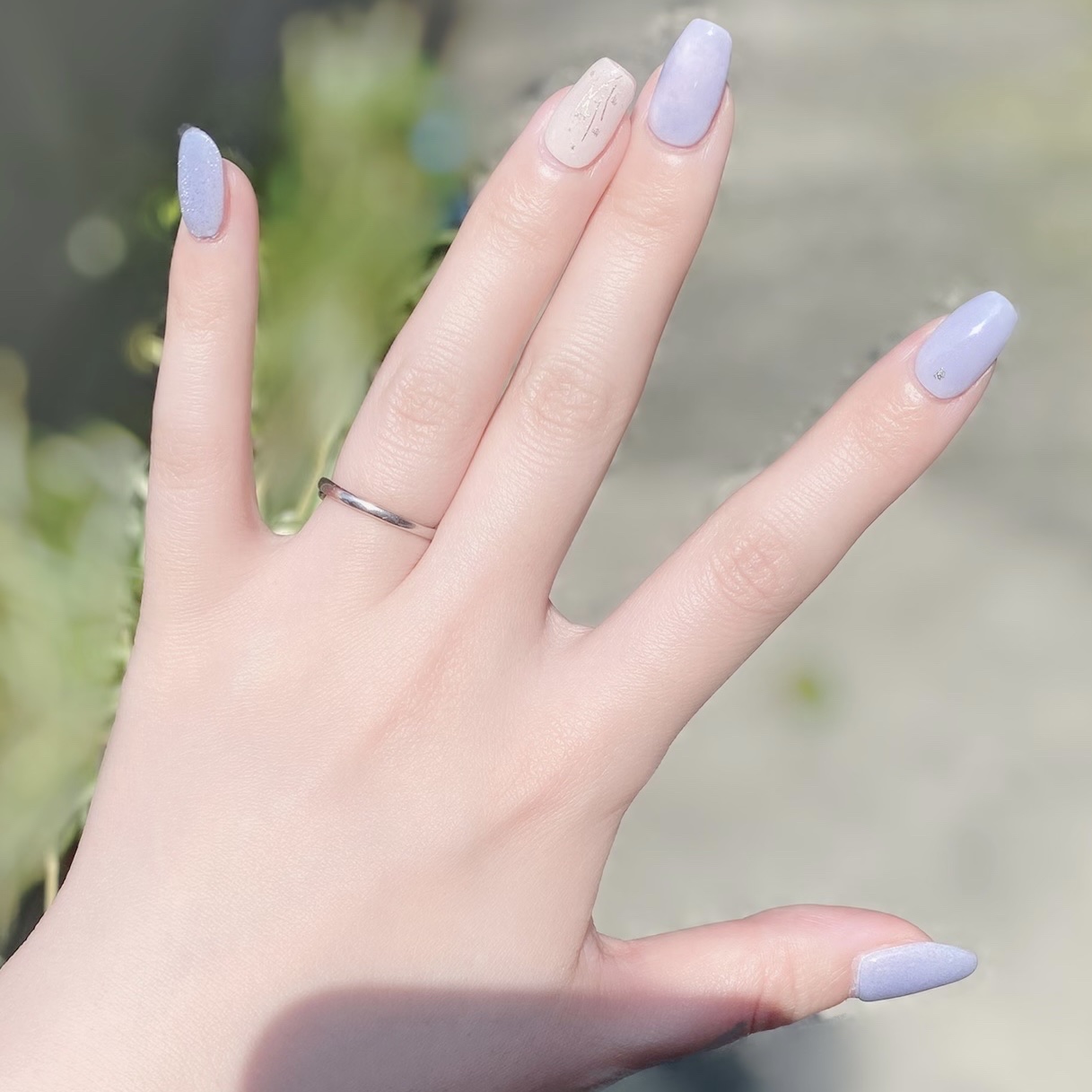 ペタリーさん貼りやすいんよ🥹 淡いブルーが可愛すぎて🥺 派手すぎないブルーで 爽やか〜なネイルになるよ! 公式オンライン限定販売 Butterfly Peaのハンドとフット
