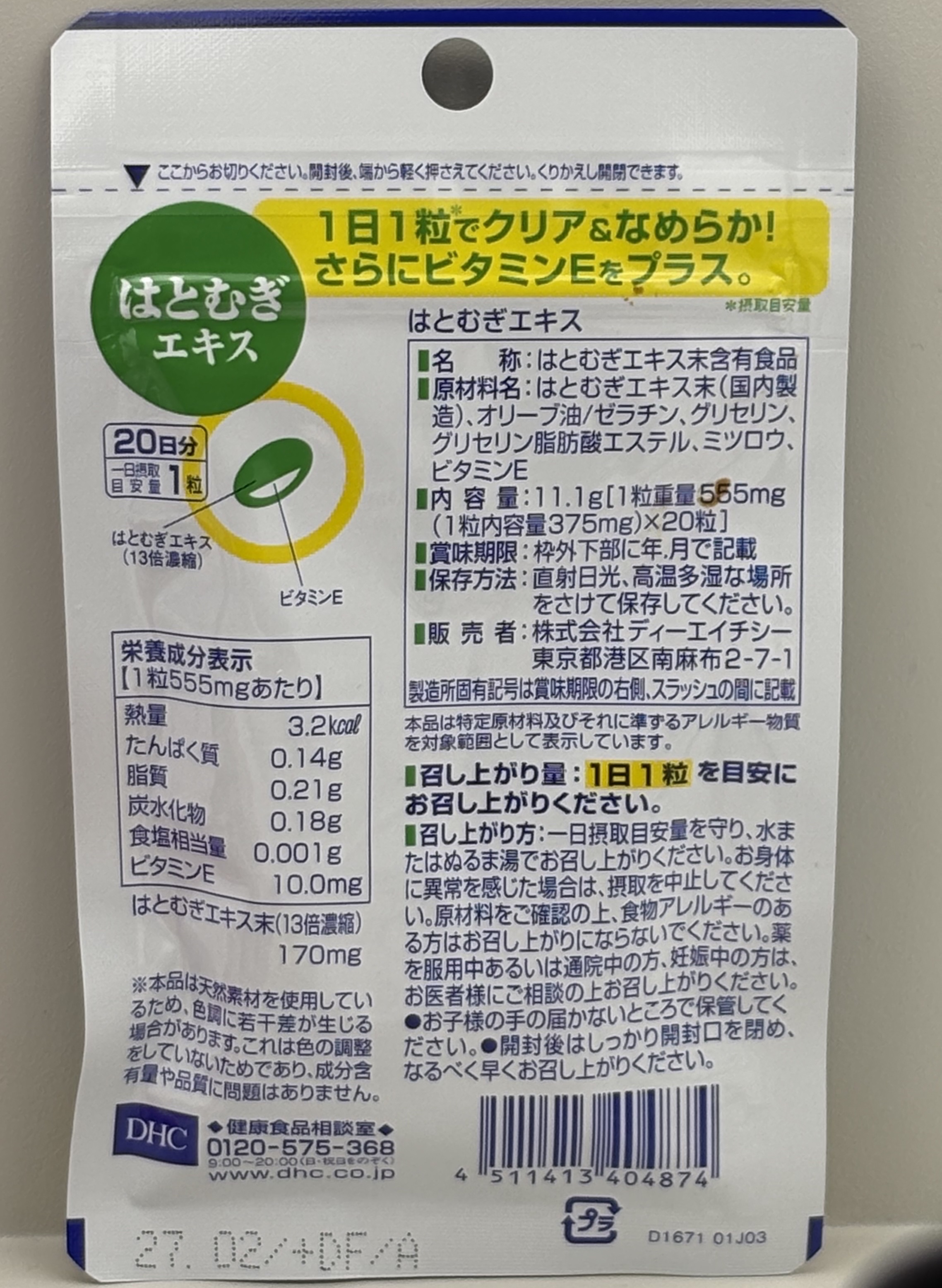 DHCはとむぎエキス、キャンペーンとかセールとか特売とか230円ほどで買えました 粒は思ったより大きいけど、一日1粒なので飲むのが辛いっていうわけでもない 実感として透明感出たとは思ってない