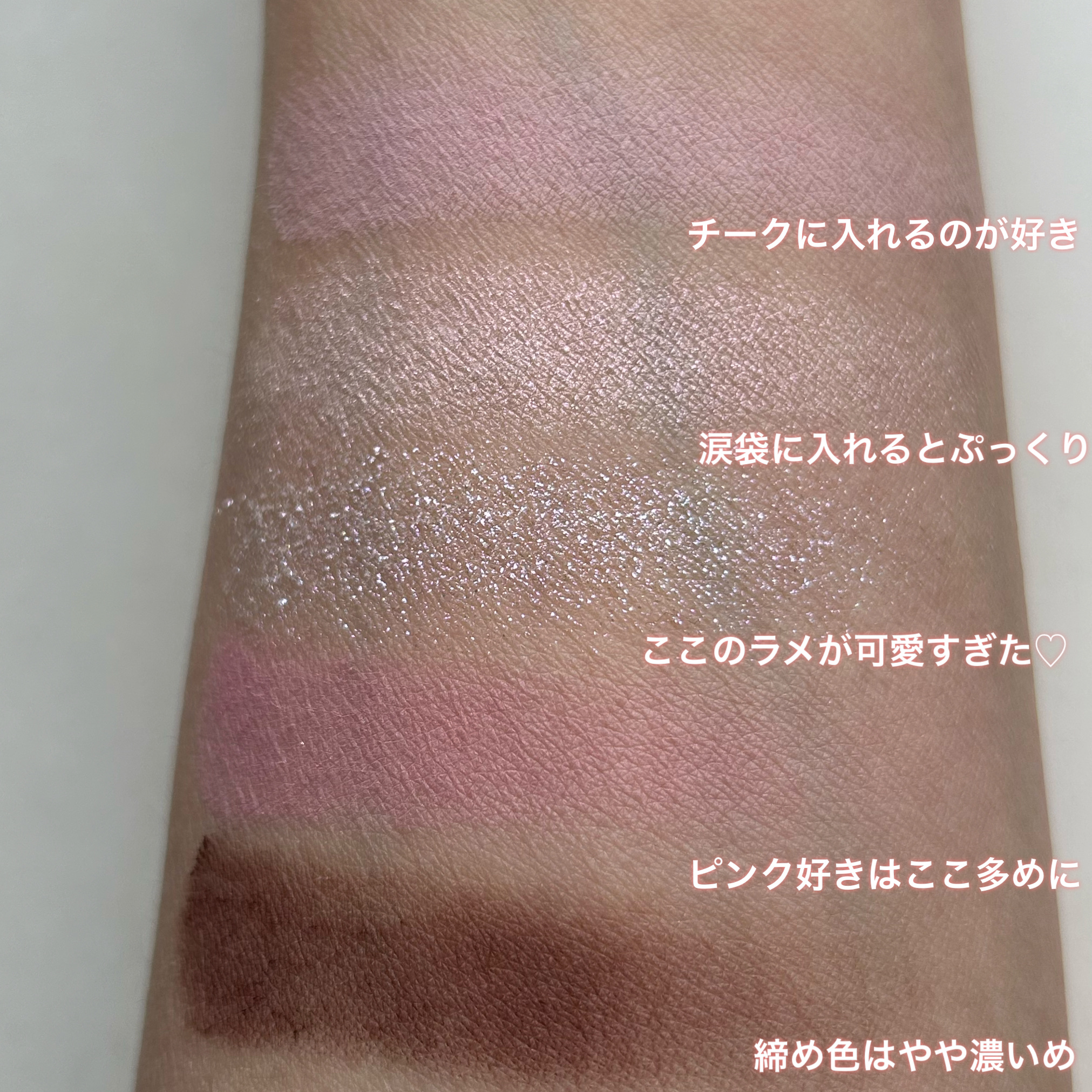 スウォッチは指塗りなので濃いめになっていますが、ブラシだともっと薄くてほわっとした発色です。 マット系①②③で超ナチュラルに涙袋を作るのがマイブームですが、①は頬に広く入れるのも可愛いし、③は眉に足すのにも使いやすいし、かなり万能だなと思っています◎ ④はパール系でさらっとした質感。ベースも粒子も発色もピンク系に感じます。