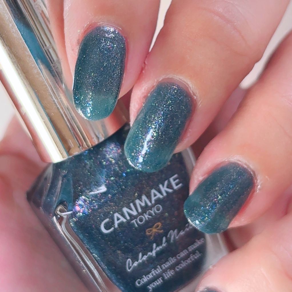 思ったよりもグリーンっぽさがあったかな! もっとネイビー感あるかな?と思ってたからちょっと惜しかった! でも400円でこのクオリティはさすがCANMAKEだよね🥺