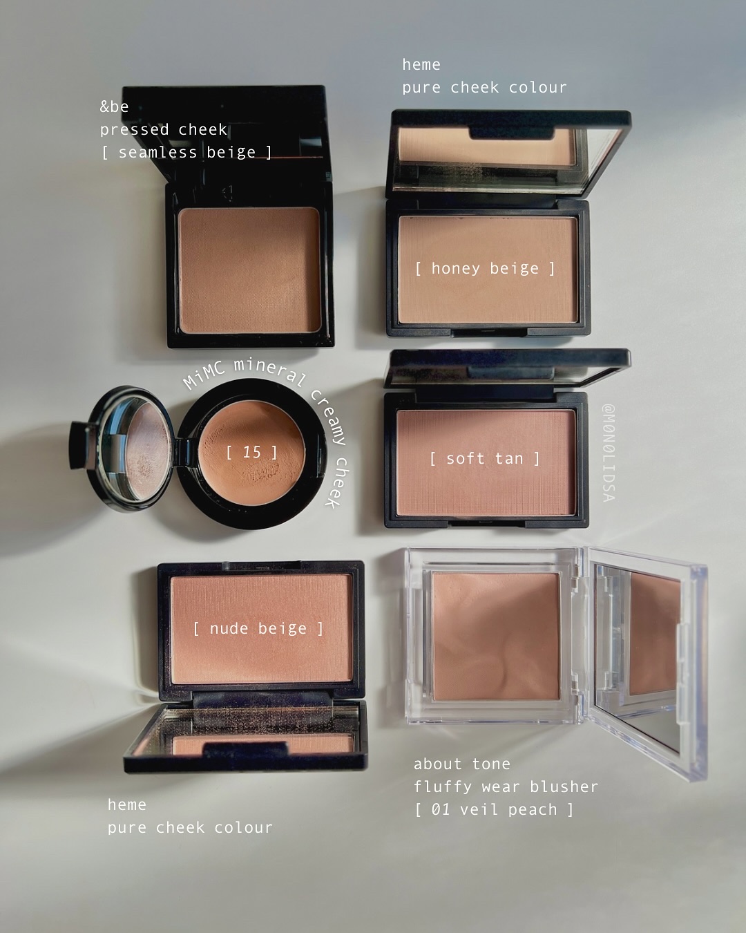 鮮やかすぎるチークが苦手な方にオススメのヌーディなベージュ&ブラウン系チーク。 色白さんやあんまり強く発色すると困るよ💦て方はRom&nd、dasique、about toneがオススメ。 nuseのリキッドチークは使うのにコツがいるけど、パウダーでは出せない艶感が綺麗✨