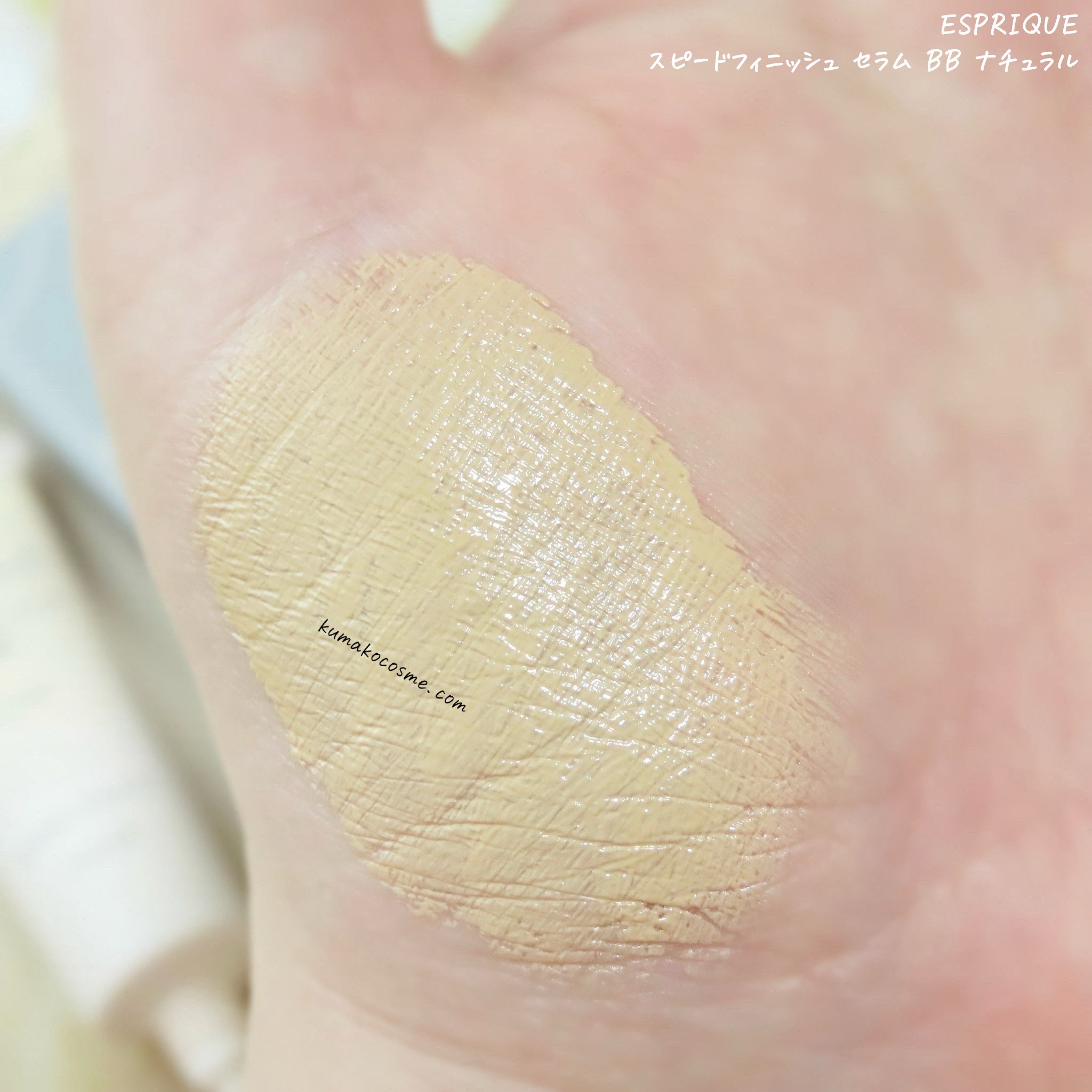 エスプリークのファンデはほんとね、あたしの好きな使用感なんだよね。 こちらは美容液・乳液・クリーム・日やけ止め・化粧下地・ファンデーションのセラムBBなの。 肌に取り出してみると、かろやかなテクスチャで伸びがありぼってりとした感じがしない。