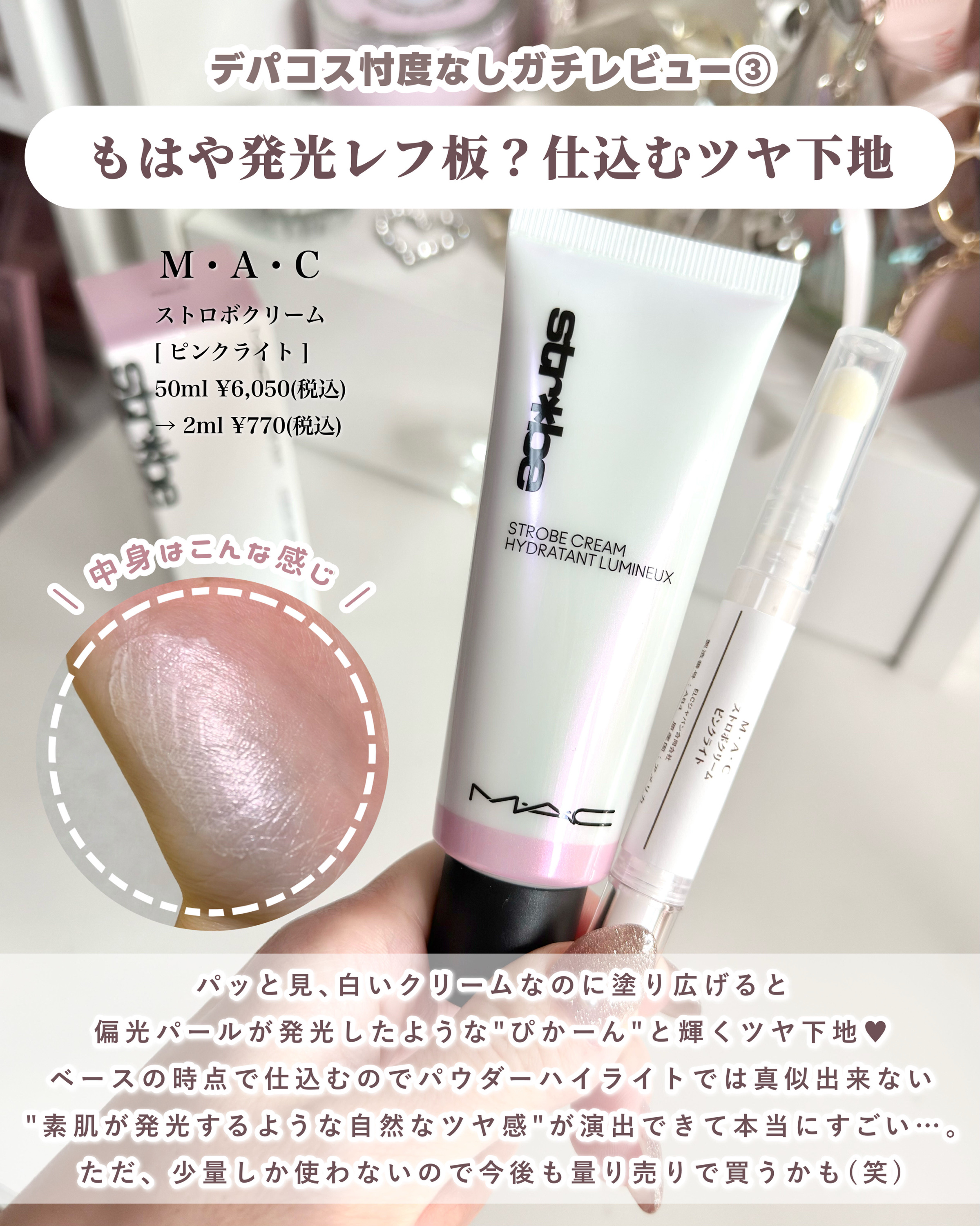 𓊆ㅤ気になるデパコス全試し🎀𓊇総額36,630円分のデパコス5点を忖度なしでガチレビューします🔥✊🏻✧•───────────•✧꒰買ってよかったに繋がるコスメ図鑑📖꒱······▸正直レビュー×コスメオタクのりちゃがあなたの推しコスメ探しをお手伝い🧸🎀✍🏻#Dior/スノーUVベース[ブルー]◎塗り広げても青白い発色だからしっかり色白肌を演出できる♥◎しっとりした使用感で乾燥しにくい✕首との差が出やすくなるので全額塗るのは注意!→→リピ前向きに検討!✍🏻#SK2/ジェノプティクスCCプライマー[ロージーピンク]◎1本5役(保湿・明るさ・ハリ・UVカットSPF50+/PA++++・下地&ナチュラルカバー)◎単品使いの場合は素肌美人に見える✨✕ベースをあれこれ重ね塗りすると崩れ方が少し汚いかも→→リピなし🙅🏻♀️❕✍🏻#MAC/ストロボクリーム[ピンクライト]◎パウダーハイライトでは表現が難しい、内側から発光したような仕上がり🌟◎1度で少量しか使わないので減りが遅い!→→リピあり🙆🏻♀️❕✍🏻#NARS/ライトリフレクティングファンデーション[04335]◎軽い塗り心地で、心地よい感覚!◎程よいカバー力で厚塗り感は出にくい!✕乾燥肌的には時間が経った時のカサカサ感が気になった→→リピなし🙅🏻♀️❕✍🏻NARS/ライトリフレクティングトーンアップヴェール◎白くみせるのではなく光で明るく見せるような仕上がり!◎乳液のように伸びが良い✕乾燥した肌に塗ると少し粉っぽいかも(?)→→リピ前向きに検討!┈┈┈┈┈┈┈┈┈┈今回は꒰SILKYCOSME꒱というサイトを利用してお得にデパコスをお試ししました♥→もちろん本物(国内購入品)◎本来現品サイズで買うと¥36,630のところ、シルキーコスメなら¥5,070でお試しできたの🥺🩷(1週間分2mlの場合)実際肌に使わないと合う合わないは分からないし、色々試したい美容好きの女の子にとっては本当にありがたいサービスだと思う…😭💕今回コラボ企画で発行してもらった限定クーポンをインスタのフィード投稿に貼ってるのでぜひ使ってみてね🏷️※本サービスは、東京都保健医療局へ内容を確認の上、薬機法に抵触しない『分割販売』として運営しています※本商品はSILKYCOSMEが独自に分割販売しているものであり、メーカー公認の正規販売品ではありません。※各感想の仕上がりは、メイクアップ効果による印象によるものです※リピの有無は自身の肌色や質感によるものなので個人感想です。#PR#デパコス