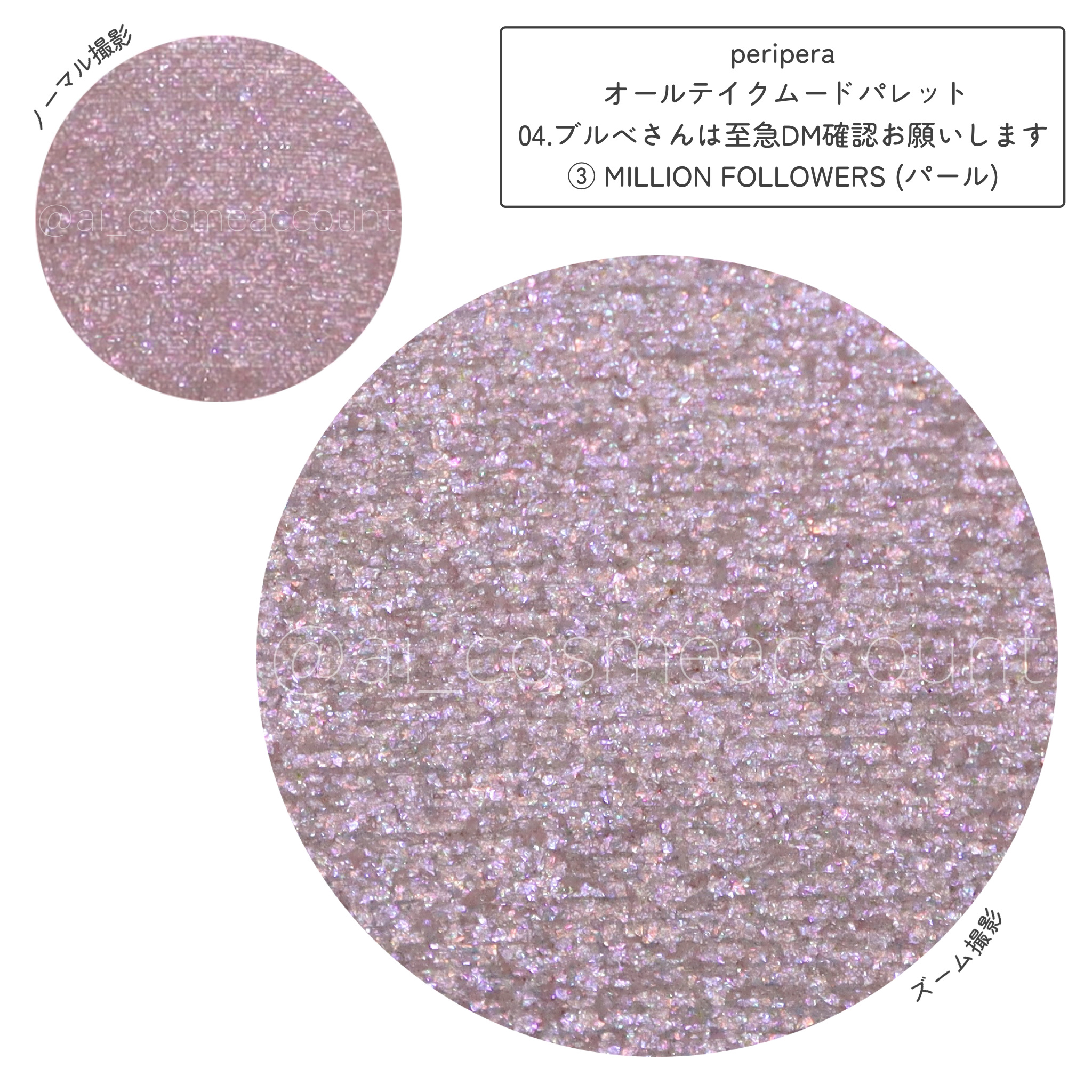 おそらくここでしか見れないアイシャドウの質感が鮮明にわかるズーム撮影/[periperaオールテイクムードパレット04.ブルベさんは至急DM確認お願いします]アイシャドウに極限まで近づいてみると、普段肉眼じゃ見えないパールやグリッターの色味や形まで鮮明に見えて綺麗だったので共有します!!(画像左上の小さい丸が通常撮影、大きい丸がズーム撮影です。)①②③④⑤⑥⑦⑧←パレット内の配置①スプリングコールドスペル(グリッター)②ピンクF4F(マット)③ミリオンフォロワーズ(パール)④パープルフルエンサー(グリッター)⑤ブルベスポンサーシップ(マット)⑥ブルベロギング(マット)⑦ブルベリチカル(マット)⑧シャドータトゥー(マット)__________________________________________商品名:オールテイクムードパレットブランド:peripera(ペリペラ)メーカー:CLUBCLIO製造国:韓国アイテム:8色アイシャドウパレット質感:マット・パール・グリッター内容量:6.0gカラー:04.IFPINK,CHECKDMPLZ(ブルベさんは至急DM確認お願いします)価格:2530円(Qoo10内公式ショップ価格)発売日:2024年5月1日全国発売
