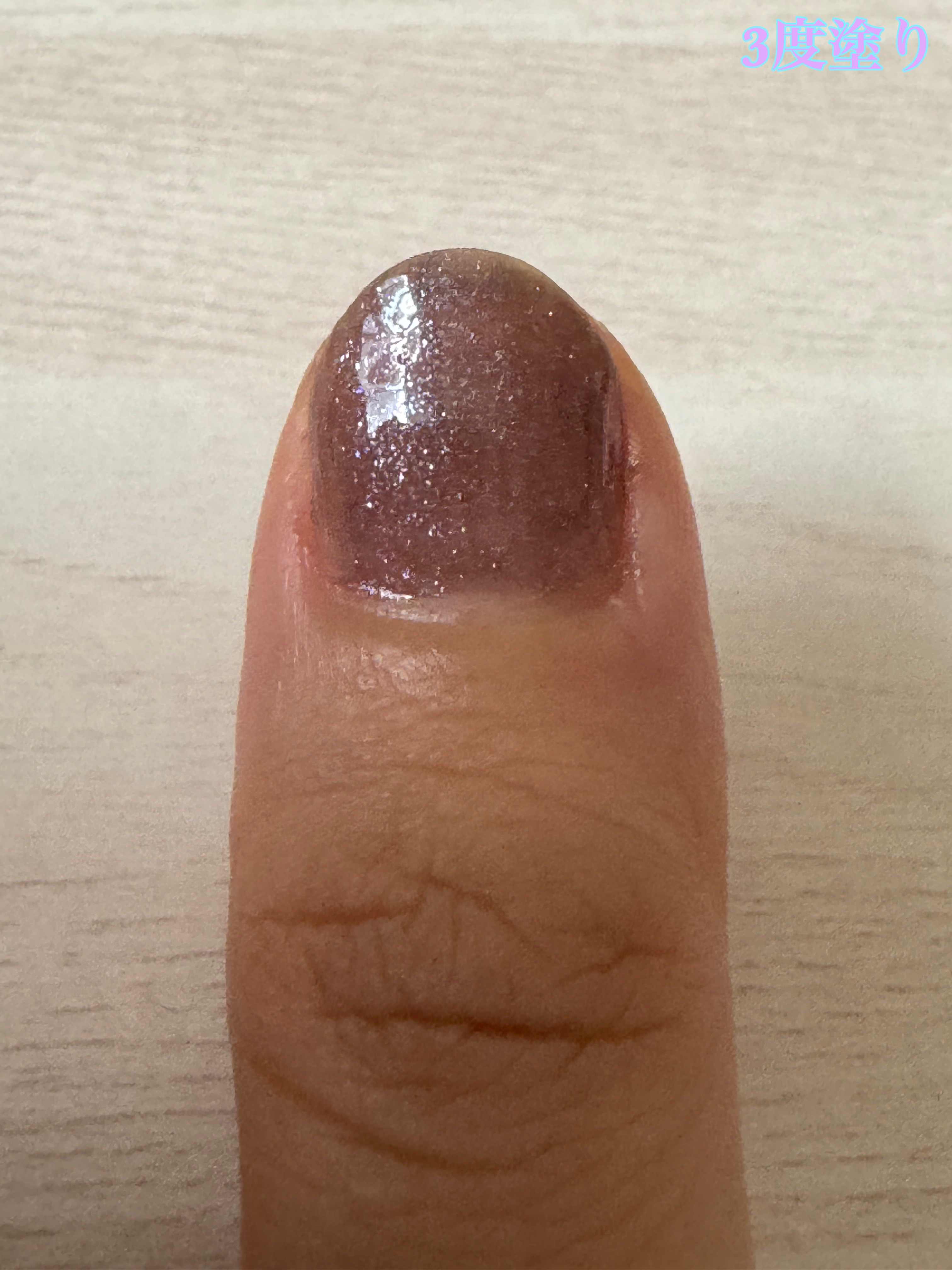 びっくりするほどめちゃくちゃかわいいー!! でもって大人っぽさがあって、大人かわいい、派手すぎない感じがまた素敵✨ ラメも多色ラメ。でも、派手すぎない。素晴らしい塩梅で、大人も使いやすいカラーです! 2枚目、1度塗り 3枚目、2度塗り 4枚目、ラメ感