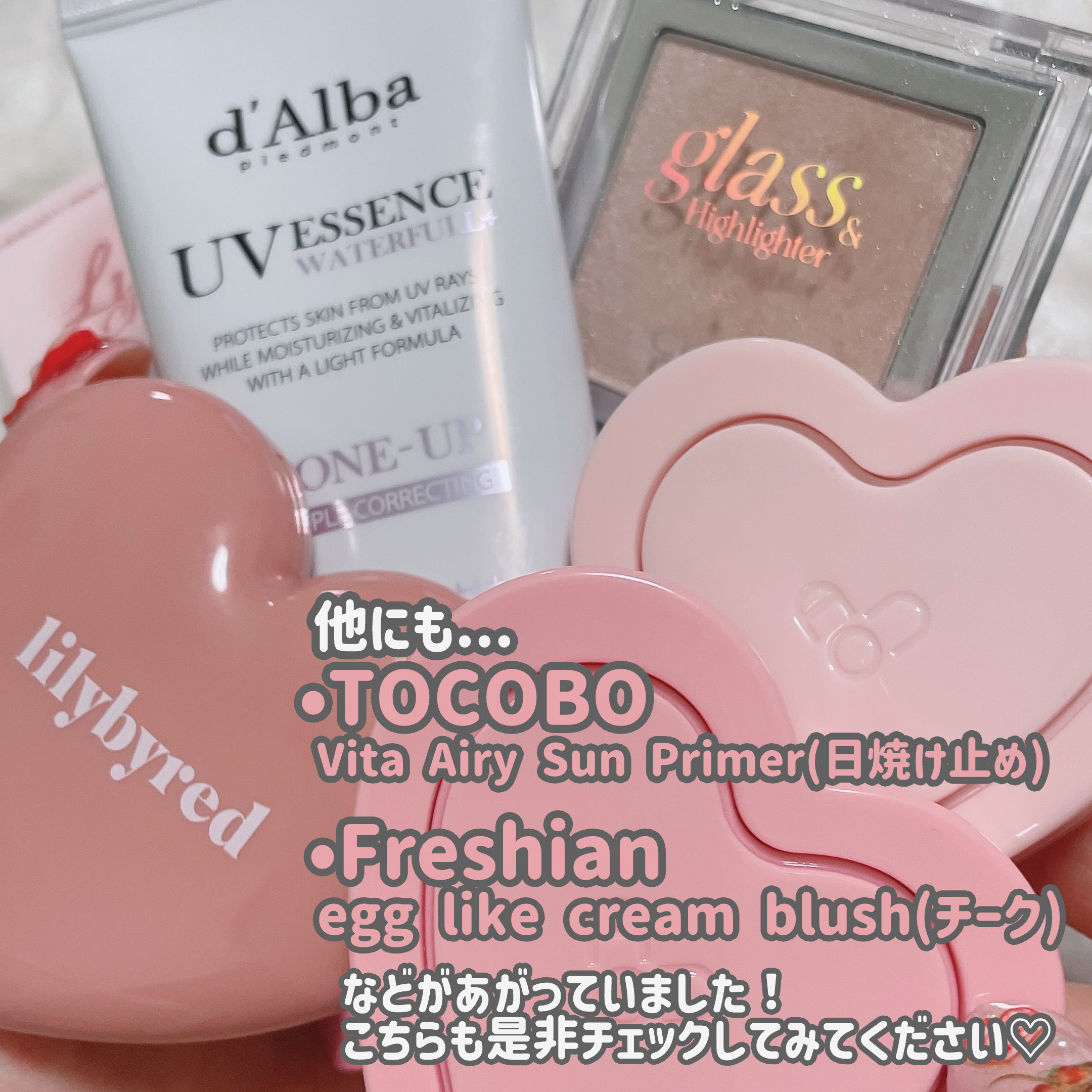[少女時代テヨンさんpickコスメ]コスメオタクのテヨンさんのpickアイテム間違いなし...!!というのも6月16日のテヨンさんのbubbleで質問に対しおすすめコスメがコメントされたと話題になっていたんですよね。スウォッチは手持ちのもののみですが全体的には♡チークおすすめ•AOU/GlowyCreamBlush,SoftCreamBlush•lilybyred/LUVBEAMCHEEKBALM12HEARTYPINKBEIGE•freshian/egglikecreamblush♡日焼け止め•d'Alba/WaterfullTone-upSunCream※画像にカラー言及なしと書いたけどパープルっぽい•TOCOBO/VitaAirySunPrimer•UIQ/biomeremedywaterysuncream♡ハイライター•CLIO/GLASS&HIGHLIGHTER01MOONGLOW•ofra/HIGHLIGHTERpillowtalkということでした!まるっと透明感のあるカラーばかりのチョイスが素敵♡気になるものがあったら是非他のカラーなどもチェックしてください☑︎#アイドル級煌めきチーク#韓国コスメ#リリーバイレッド#ブルベ夏メイク#イエベ秋#韓国コスメ