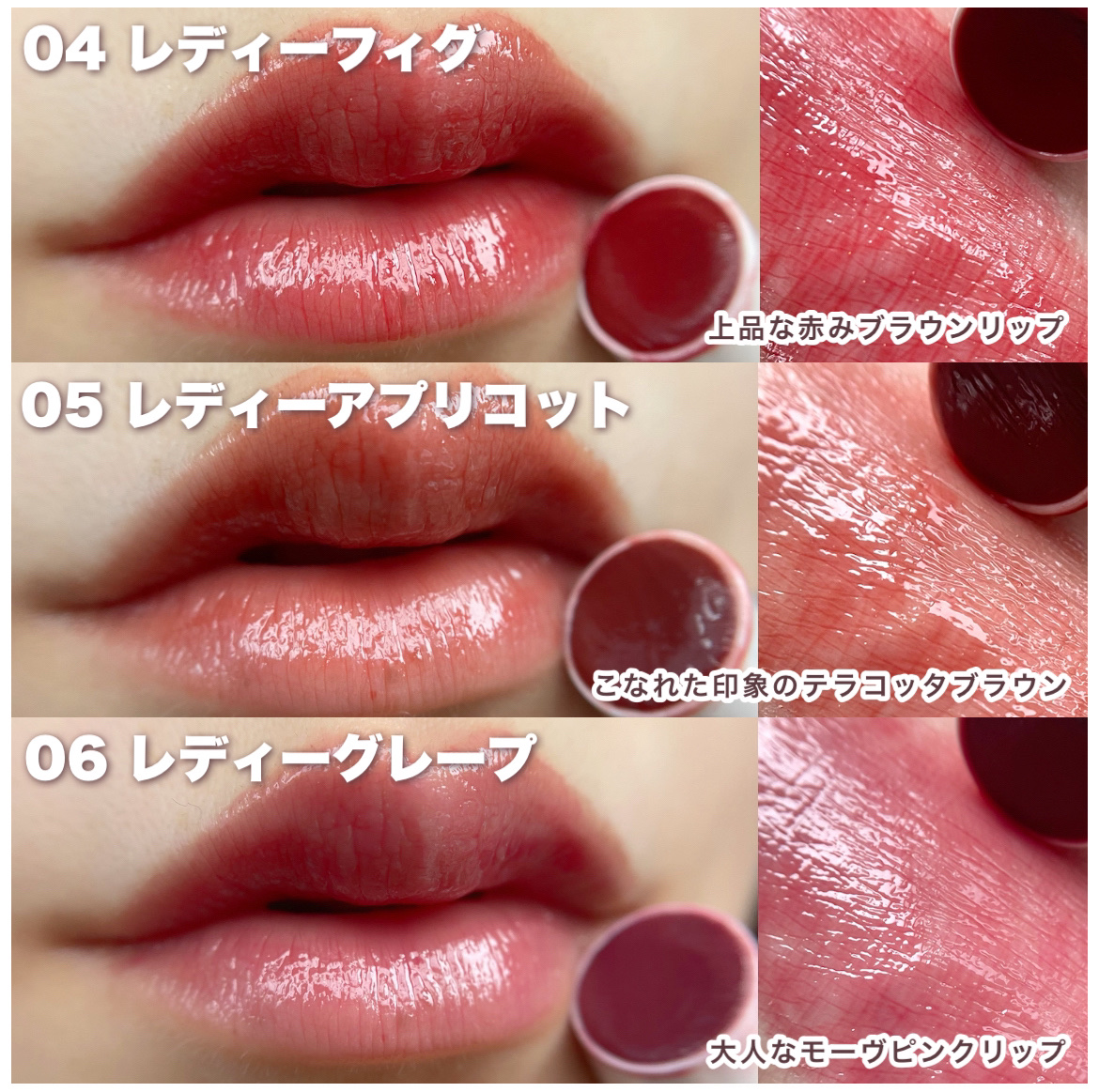 透け感のある発色で むっちりとしたツヤ感が可愛すぎる仕上がり🩷 カラー展開は全6色で、 01 ベイビーベージュ 多色パール入りでツヤ感UPなピンクベージュ 04~06はパール無しの比較的発色強めです!