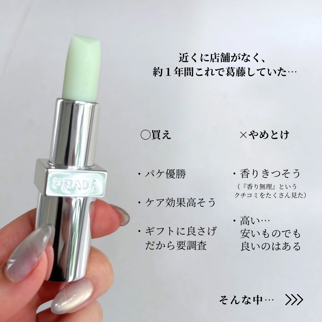 PRADAから出たリップバーム🫰🏻 ロゴをあしらったアクセサリーのような高級デザインで、持ってるだけでテンションが上がる❤️🔥 荒れづらい唇に❣️ ベタつきを抑えた洗練された艶めきで、色がのらないバームだからジェンダーレスなギフトとしてもおすすめ☺︎ PRADAが好き!ちょっとしたプレゼントに!っていう人にはぴったりだと思います🐰