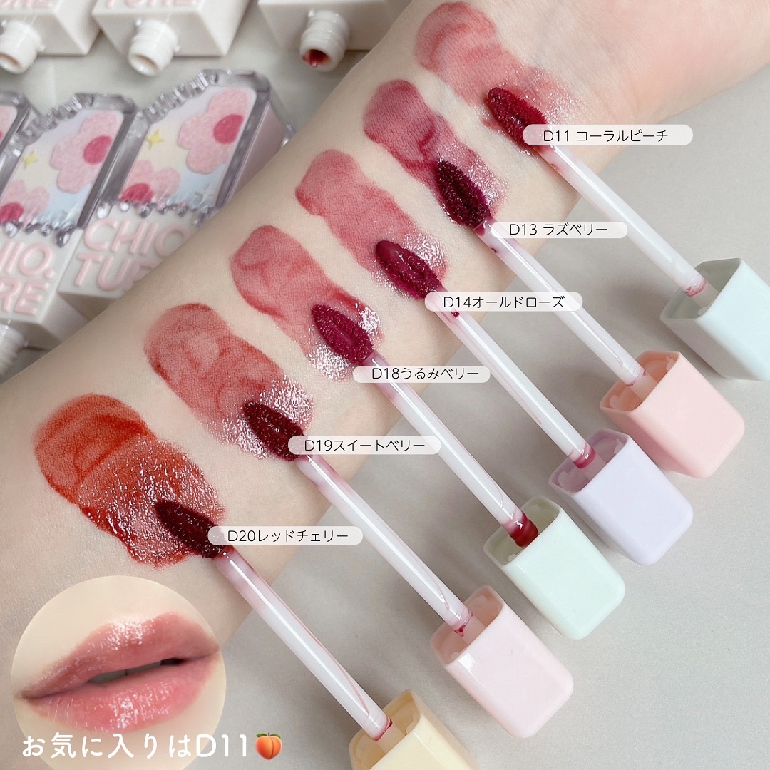 CHIOTURE/アイスクリームリップ🍦全色 D11 コーラルピーチ ラメ入り D13 ラズベリー D14 オールドローズ D18 うるみベリー リップグロス D19 スイートベリー D20 レッドチェリー 各2ml @chioture_jp #chioture #チオチュア #アイスクリームリップ #plazaでアイスクリームリップ #中国コスメ #PR