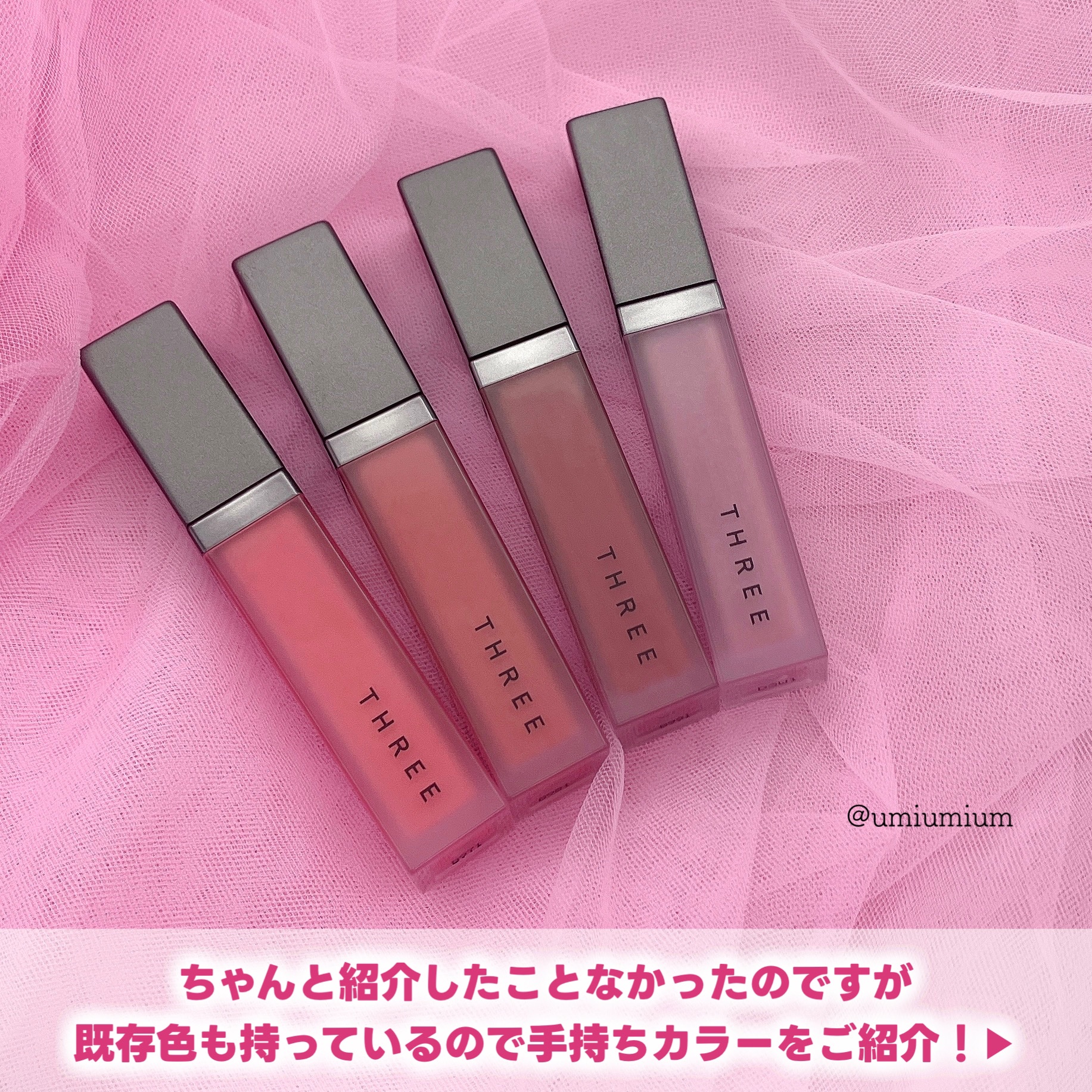 限定だけどまだ買える!THREE潤いリップ多色パール入りライラック💜THREEディヴァインリップジェムX04BREATHLESS(限定)¥3,850(税込)こんにちは!うみかです!いつも♡📎フォローありがとうございます😊本日はTHREEの2024年秋コスメから大好きなティントリップの限定ライラックカラーをご紹介。2024年7月31日(水)から発売されている限定色です。実は買ってた…🥹✨投稿時点でもまだ公式オンラインでは在庫あったので紹介させてください🙏🏻💕みずみずしいテクスチャーでちゅるっとした仕上がりが可愛い、優しいティント効果のあるリキッドリップです。本当に軽くて薄膜仕上がりでつけているのを忘れるくらい…落ち方綺麗だし唇も乾燥知らずで唇が乾燥しやすい私は気に入っております◎X04BREATHLESSはレッド、ブルー、パープルの微細なパールが配合されたミルキーなライラック。ほんのり柔らかい青みでシアーな質感。これは可愛いですなあ…単色でも仕えるけど重ね付けも◎実はちゃんと紹介したことないのですが既存色も持ってます😂持ってるカラーもせっかくなのでスウォッチと着画載せておきます!お買い物の参考になれば嬉しいです!持っているカラーはこちらの3色💁🏼♀️03FLOWERLAUGHTER:柔らかいコーラルピンク04KISSTHESKY:クリアな明るめオレンジ06FALLFORME:落ち着いた赤みブラウン既存色も可愛いぞ〜〜04番塗ってみると意外とオレンジ強すぎなくてブルベな私も使いやすくて◎X04は限定色なのでお早めにチェック🙌🏻気になっている方のご参考に少しでもなりますと幸いです!その他Instagram投稿はこちらから!@umiumium7777ここまでお読みいただきありがとうございました😊#three#スリー#ディヴァインリップジェム#three_リップ#リップ#リップティント#ティントリップ#デパコス#デパコスリップ#限定コスメ#バズリップ#新作コスメ#新作コスメ2024#ブルベ夏_リップ#ブルベリップ#ツヤリップ#発光級ツヤコスメ