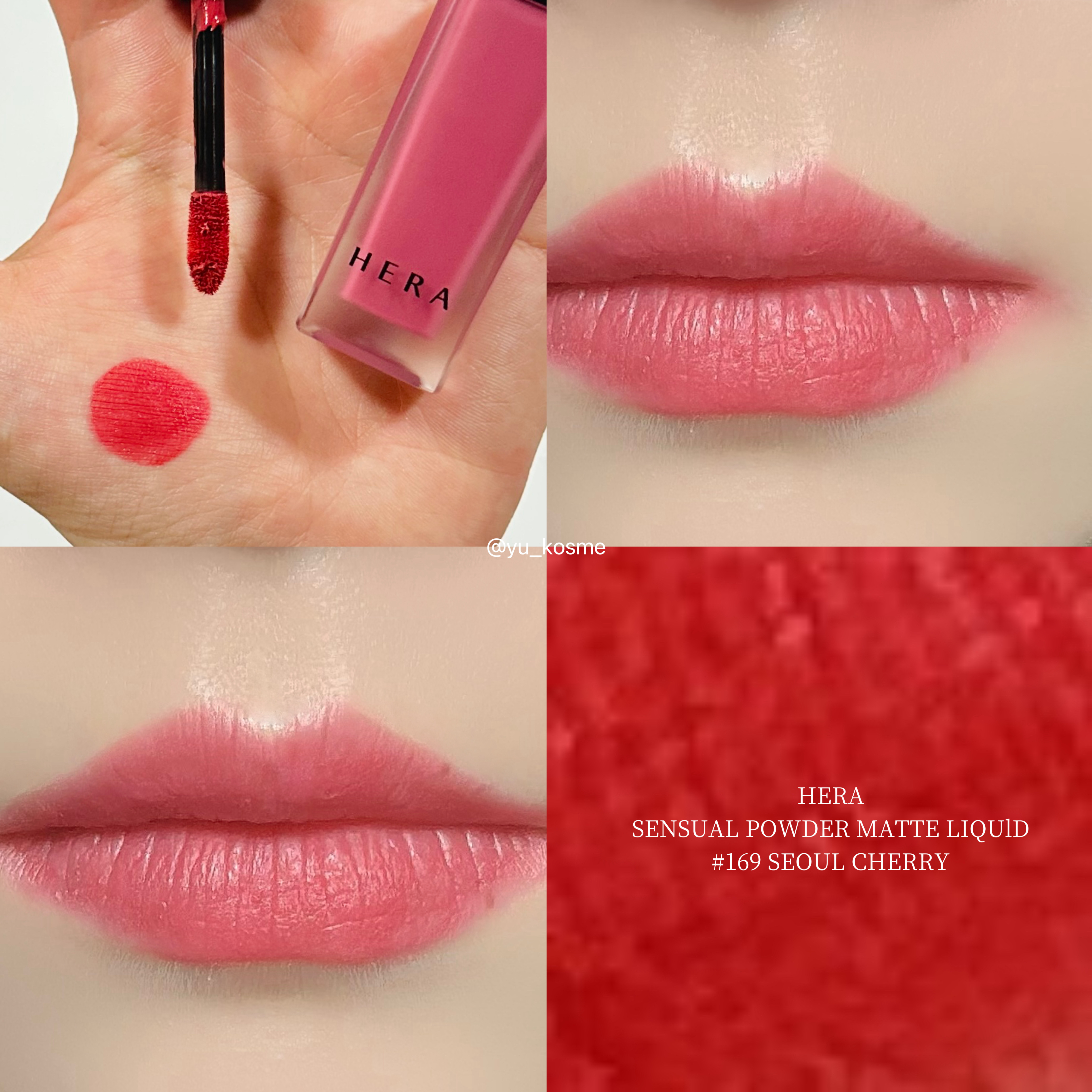 \存在感が欲しい時にもってこい❣️/♡HERASENSUALPOWDERMATTELIQUID169.SEOULCHERRY¥4,840税込華やかさ抜群の鮮やかなチェリーレッドカラー🍒公式の写真だと、くすんだモーヴピンクっぽく見えるのに、実際...