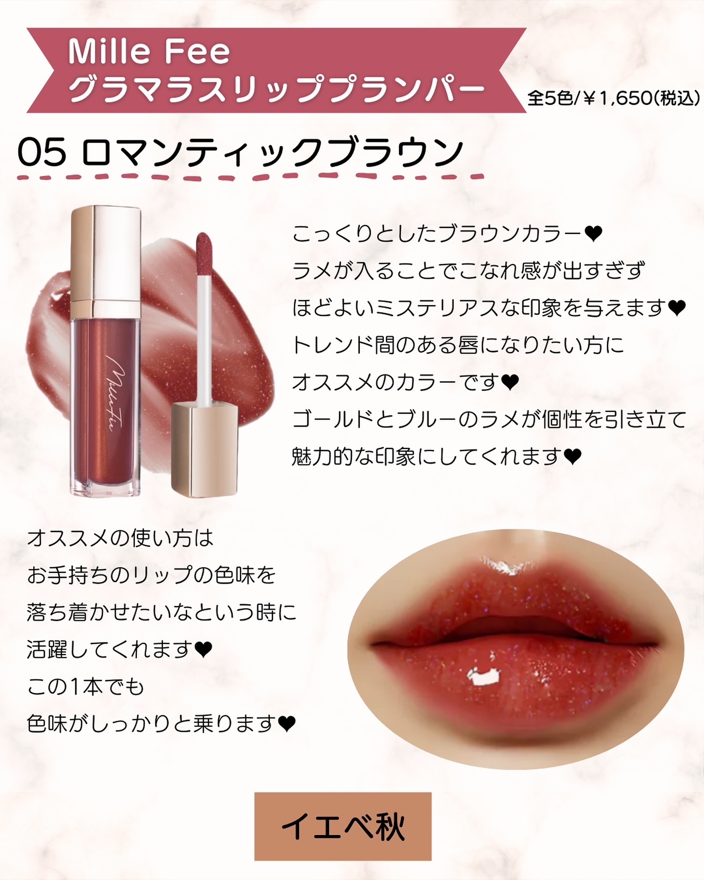 あゆみみです🩷パーソナルカラーやコスメの耳より👂🏻な情報を16タイプ・パーソナルカラーアナリスト®のプロの視点からご紹介していきます!...本日は【パーソナルカラー仕分けMilleFeeグラマラスリッププランパー】についてお話ししていきます🌸✼••┈┈••✼••┈┈••✼••┈┈••✼••┈┈••✼《#MilleFee#グラマラスリッププランパー》全5色/¥1,650(税込)@millefee_official✼••┈┈••✼••┈┈••✼••┈┈••✼••┈┈••✼MilleFeeからつやつや配合のぷっくりプランパーが登場🩷“キスしたくなる、飴玉リップ”というキャッチフレーズ通り透き通ったツヤが魅力的なプランパーです✨️プランプ効果があるのでジンジンするけどそれがクセになる🩷01以外はラメが入っていてより一層飴玉感が増して可愛い🩷✼••┈┈••✼••┈┈••✼••┈┈••✼••┈┈••✼【01クリアブロッサム】💛🩵🤎🩷全タイプにオススメ❤︎【02ハニーアプリコット】💛イエベ春にオススメ❤︎【03ドリーミーピンク】🩵ブルベ夏にオススメ❤︎【04クリスタルカシス】🩵ブルベ夏にオススメ❤︎【05ロマンティックブラウン】🤎イエべ秋にオススメ❤︎✼••┈┈••✼••┈┈••✼••┈┈••✼••┈┈••✼フォローして他の投稿も見てみてください🩷@ayumimi_color👈🏻✼••┈┈••✼••┈┈••✼••┈┈••✼••┈┈••✼ラピスの16タイプカラーメソッド®に基づくアナリストの個人の見解です...9月9日より長野駅周辺で16タイプ・パーソナルカラー診断を再開いたしました🌈ご予約・詳細はハイライトをご覧ください📱✨️#パーソナルカラー#パーソナルカラー長野#16タイプパーソナルカラー#16タイプパーソナルカラー診断#長野パーソナルカラー診断#イエベ春#ブルベ夏#イエべ秋#ブルベ冬#イエベ#イエローベース#ブルベ#ブルーベース#パーソナルカラー診断長野#16タイプパーソナルカラー診断長野#16タイプパーソナルカラー長野#パーソナルカラー診断長野#長野市#コスメ#コスメ購入品#コスメオタク#コスメ大好き#コスメ大好きさんと繋がりたい#デパコス#プチプラコスメ#プチプラ#ミルフィー#プランパー#リップ