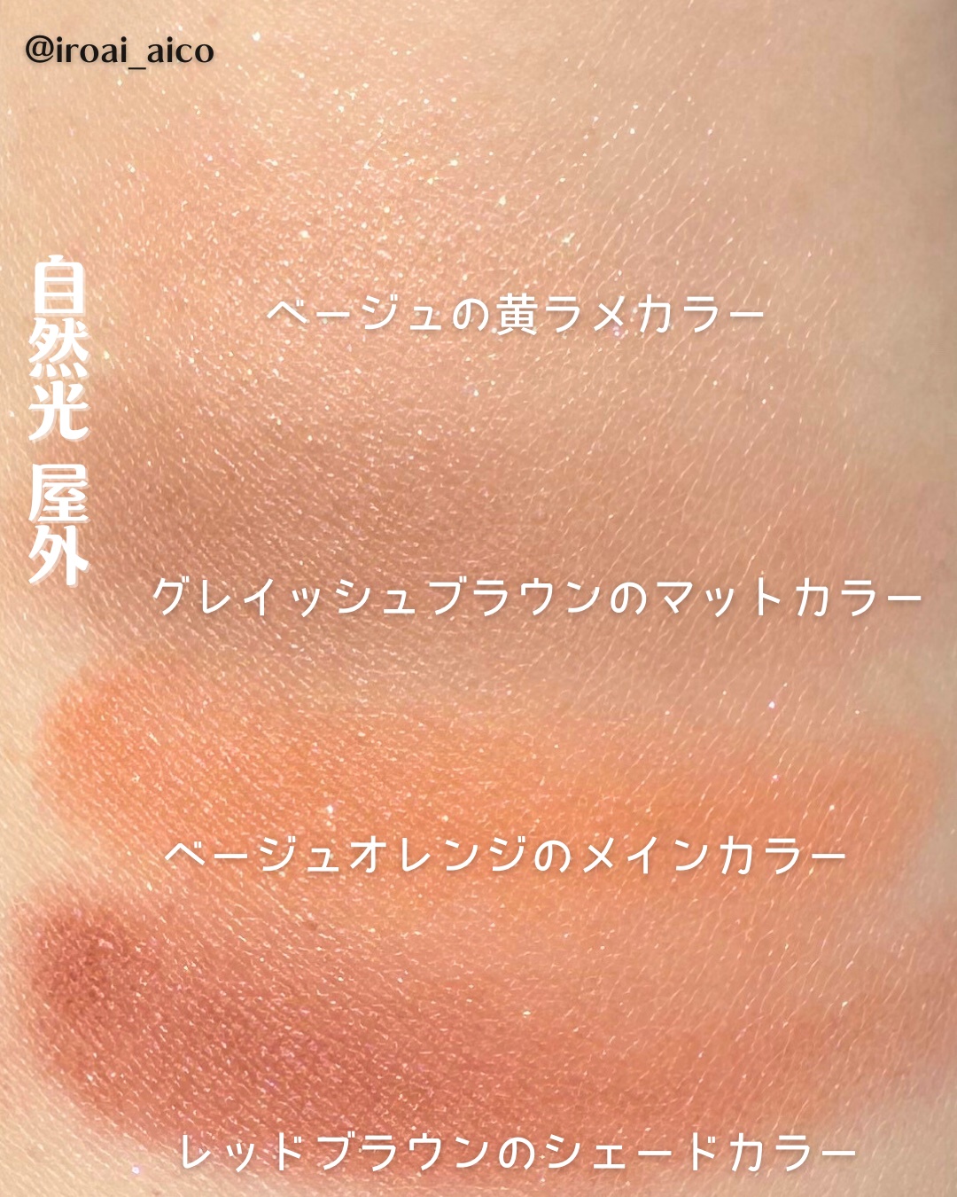 @iroai_aico#ルナソル#アイカラーレーションN01NostalgicTimeまろやかに溶け込むオレンジベージュパレットです!カラーメイクにご抵抗のある方やベーシックカラーばかり使う方にも是非手に取ってみていただきたい使いやすさです✨あたたかみがお得意な#イエベ秋#オータムの方におすすめ!#イエベ春#スプリングの方は右上のカラーをやわらかく!大人顔のイエベさんや大人っぽく見せたい方にもおすすめです💕ーーーーーーーーーーーーー@iroai_aicoは高知市で■パーソナルカラー診断■顔タイプ診断■骨格診断■パーソナルスタイル診断■メイクレッスンをしております⭐︎#パーソナルカラー診断#春コスメ購入品レポ#新作コスメ#デパコス#アイメイク#アイシャドウパレット#コスメ#春コスメ#コスメレポ#スウォッチ#コスメマニア#アイシャドウ#秋コスメ#コスメ紹介#春映えチーク&リップ#イエベ#イエベ春コスメ#コスメレビュー#メイク#スウォッチ#新色コスメ