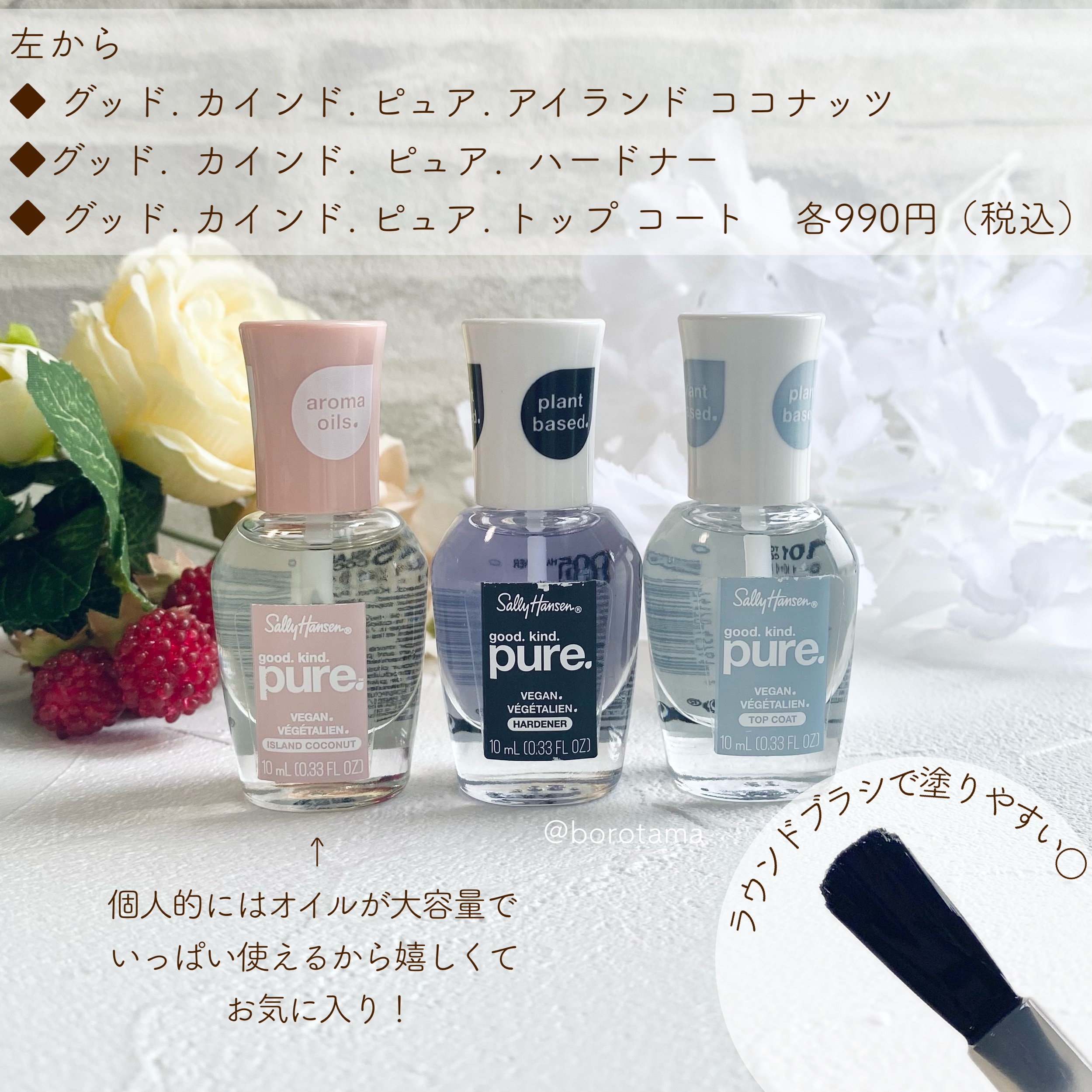パステルミルクネイル🍼今日は10月4日(金)より全国のロフト、Amazonにて発売開始しているサリーハンセンのネイルを紹介〜🙌今回登場しているカラーパステル系が多いからイエベ秋の私よりイエベ春の妹の方が似合うカラー多めだった🌼◇グッド.カインド.ピュア.ラスティングカラー◆115パウダールーム上品パールで魅せるシアーベージュ◆200ピンククラウドチャーミングで愛らしいベビーピンク◆210ピンキークレイ幸せを引き寄せる!ペールピンク◆230ピンクカルダモン大人な甘さのコーラルピンク◆260エコローズ永遠の愛を誓うルビーレッド◆370クリスタルブルーピンクラメで運気UP!◆375ミントリフレッシュフレッシュな気持ちに導くアイスグリーン◆380サンタスティック心を満たすクリームイエロー◇グッド.カインド.ピュア.デミマットネイルカラー(040)私はハードナーとして使っているけどこれ不思議質感!淡いピンク色でマットに仕上がるからナチュラルになじんで仕事は派手なネイルNGなんですがこれは大丈夫だった😉普段使いしやすいですねー!クリアタイプのほうが好きな人は🔻◇グッド.カインド.ピュア.ハードナー(005)こっちの方がいいかと○どちらもラウンドブラシなので爪の根本も塗りやすくて好き💞あとは🔻◇グッド.カインド.ピュア.トップコート(101)を上から重ねることでハードナーとかを単品で使うよりもネイルもちがよくなるけど040のマットのうえに重ねると艶々になるからこれは重ねるかちょっと迷う💭私はマット仕上がりが気に入ってるからそのまま単品使用することが多いです!好きな質感で楽しんで〜🙌大容量で嬉しいのが🔻◇グッド.カインド.ピュア.アイランドココナッツ(015)残量気にせずしっかりケアできるから◎最近乾燥で手が荒れてたのでハンドクリームと一緒に枕元に置いて寝る前にすぐに使えるようにしています🛏価格は各990円(税込)気になったアイテムチェックしてみてね!#物品提供#サリーハンセン#SallyHansen#ネイル#ネイルポリッシュ#マニキュア#新作ネイル#新作コスメ#秋コスメ#ネイルハードナー#ネイルオイル#ネイルケア#ハンドケア#ハンドケアで指先美人