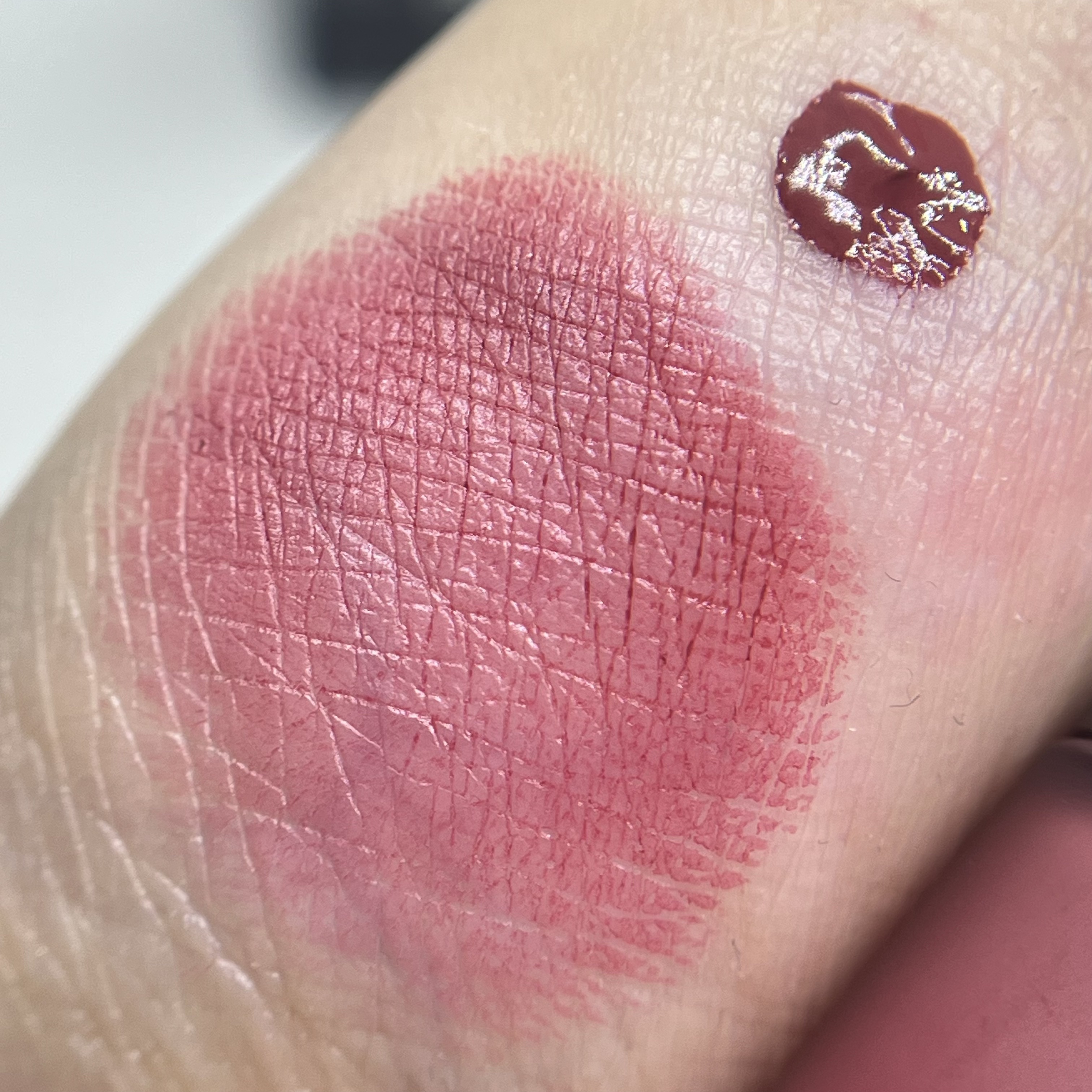 リップにも使えるリキッドチーク、それぞれの比較と混ぜた状態です。重ねてもヨレにくいので、手の甲に出して調節したり、ちょっとずつ重ねたりが1番いいんですが、少々濃くなっても気にならないのが53 浮かない白っぽいピンクはありそうでなかなかない。50.5は、夏に大活躍なカラーでもあるんですが、ナチュラルなコーラルでこれもすごく肌馴染みがいい。 時短にもなるしリップにも使えるし、目元にほんのり使うのも可愛い上に崩れにくい。敢えていうならカラバリ増えてくれ!!!