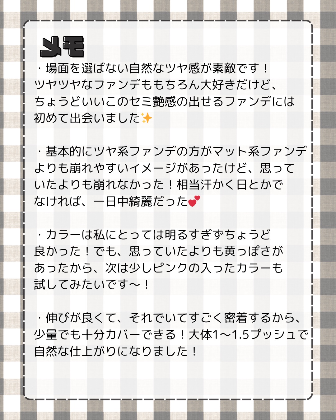 ◎化粧モチ◎ツヤ◎崩れ方綺麗◎塗り心地◎カバー力マットより伸びがいい。控えめなツヤ。マットより塗ったあとの違和感が少ないから私はグロウタイプ推し。しっかり隠したい人にはカバー力はもしかしたら足りないかもしれないけど、私には十分過ぎるカバー力。使ってる時肌荒れしてないから、肌荒れした時のレビューは忘れてなければ書く。タッチアップするとき、つけてすぐは浮いてる感じするけど1時間しないうちに馴染むからタッチアップと別にサンプルもらって試すがいいと思う。