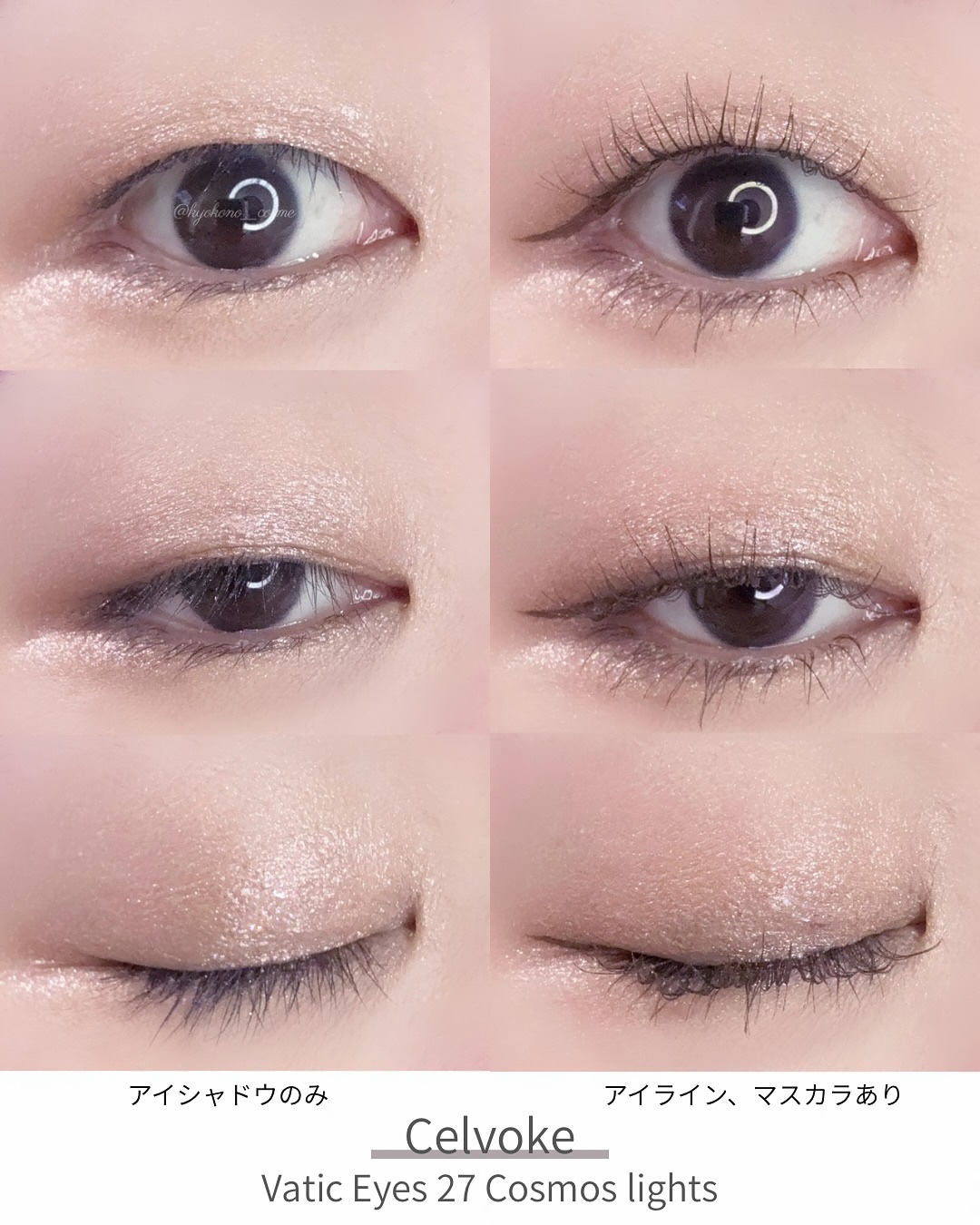 Celvoke ヴァティックアイズ27 コスモスライツ28 シグナス今日はCelvoke〜😚✨キラキララメが可愛い単色シャドウです🥰ベースに27コスモスライツ、二重幅に28シグナスをのせています☺️色がしっかりつくわけではないので、ほんのり色...