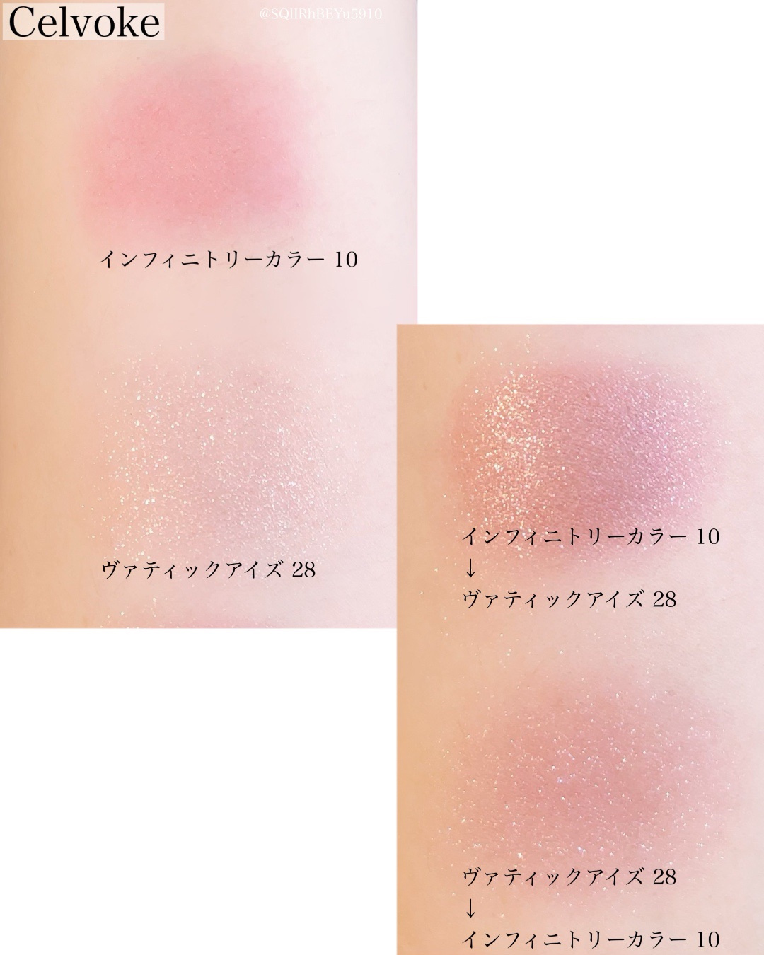 Celvoke ヴァティックアイズ27 コスモスライツ28 シグナス今日はCelvoke〜😚✨キラキララメが可愛い単色シャドウです🥰ベースに27コスモスライツ、二重幅に28シグナスをのせています☺️色がしっかりつくわけではないので、ほんのり色...