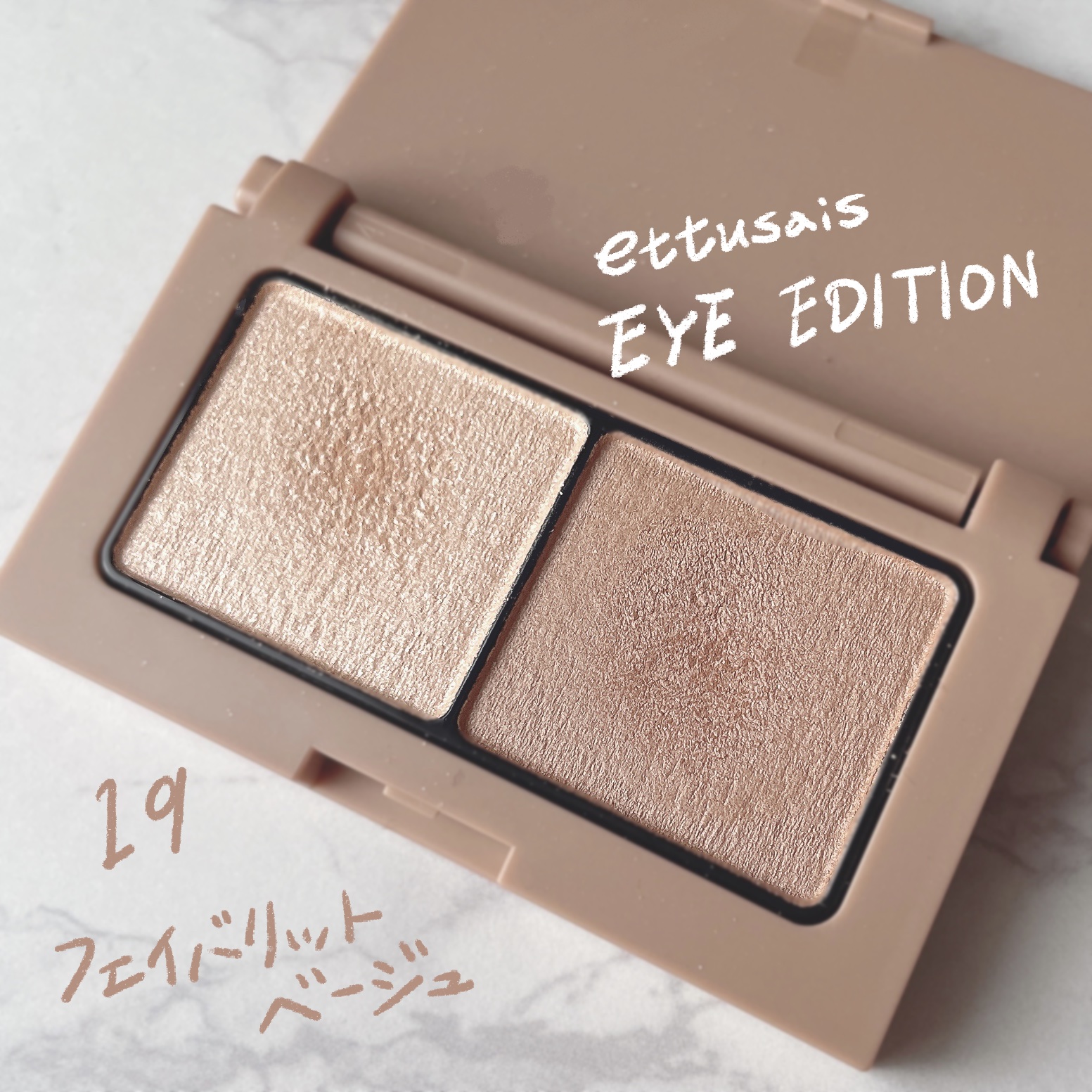 ettusaisエテュセアイエディションカラーパレット19フェイバリットベージュ左のラメのキラキラ感がとても綺麗でした!ほんのりピンク味のある繊細な輝きで、華やかさがでます。冬のイルミネーションメイクにも使いたくなるかわいさです✨右のカラーは...