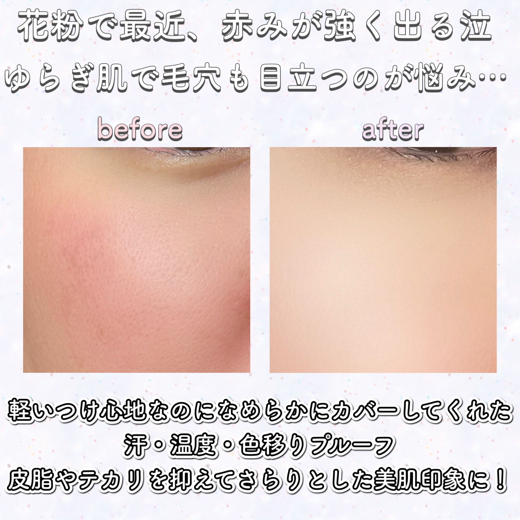 保湿ケアと角質ケア成分を強化したそう!口周りは皮剥けしやすい乾燥肌で、おでこはテカリやすい私も、ヒビ割れや皮脂崩れせずに使えたよ! カバーカも自由自在で、従来品の優れたカバー力はそのままに、フォーミュラとプレス加工を改良したそう! 軽やかで肌負担を感じなかった!ほわっとしているのに気になる赤みや毛穴が納得の仕上がりに隠れたよ