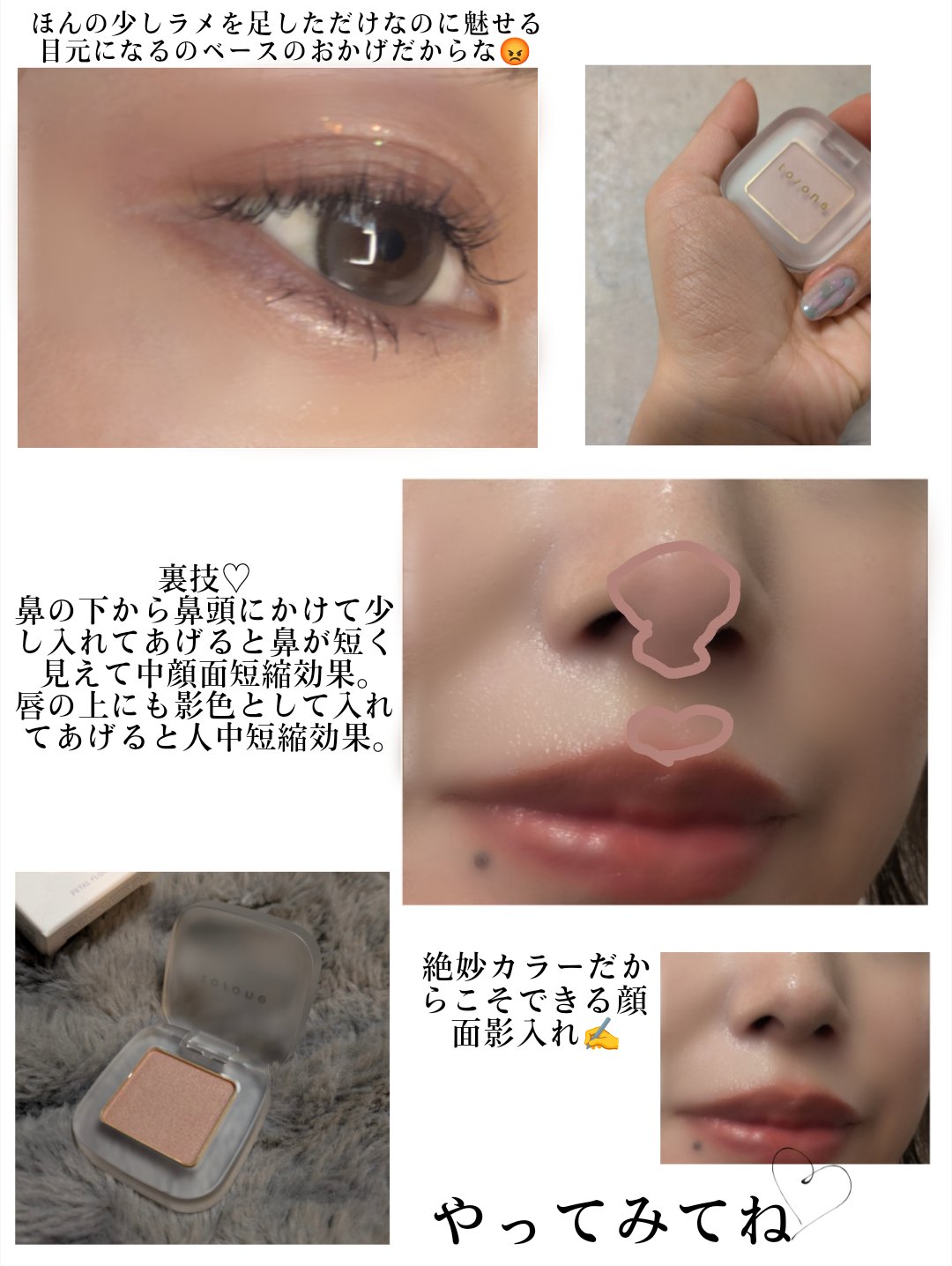めっちゃ可愛いです、これ!🥰 テクスチャは、柔らかく、しっとり系 ✔︎ふんわりフィット ✔︎優しい発色 ✔︎ピンク味が、可愛いんだけど、馴染む 単色使いだと、落ち着いた大人っぽい印象に。他のアイシャドウと組み合わせて深さを出してもとても可愛い。