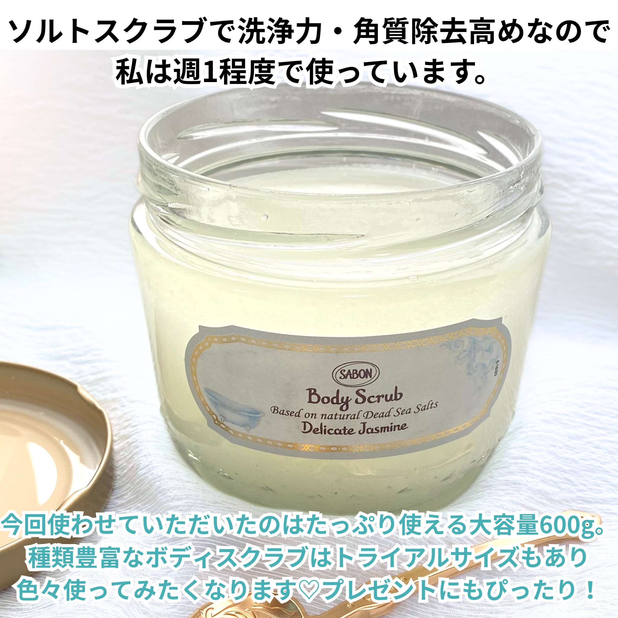 アットコスメ様のプレゼントキャンペーン当選でいただきました✨元々小さいサイズを使っていたので大容量の600gは嬉しすぎる💕ミネラル豊富な死海の塩とボタニカルオイルを配合した人気のボディスクラブはよく混ぜた後、濡らした肌に優しくマッサージするように馴染ませて洗い流すと古い角質が落ち、すべっすべに✨さらに、オイル配合のおかげでしっとり保湿されるので乾燥しやすい季節も使いやすくて年中大活躍❣️デリケート・ジャスミンの爽やかでリラックス感溢れる香りもとにかく良くて、パスタイムが至福の時間になります。ソルトスクラブで洗浄力・角質除去高めなので私は週1程度で使っています。