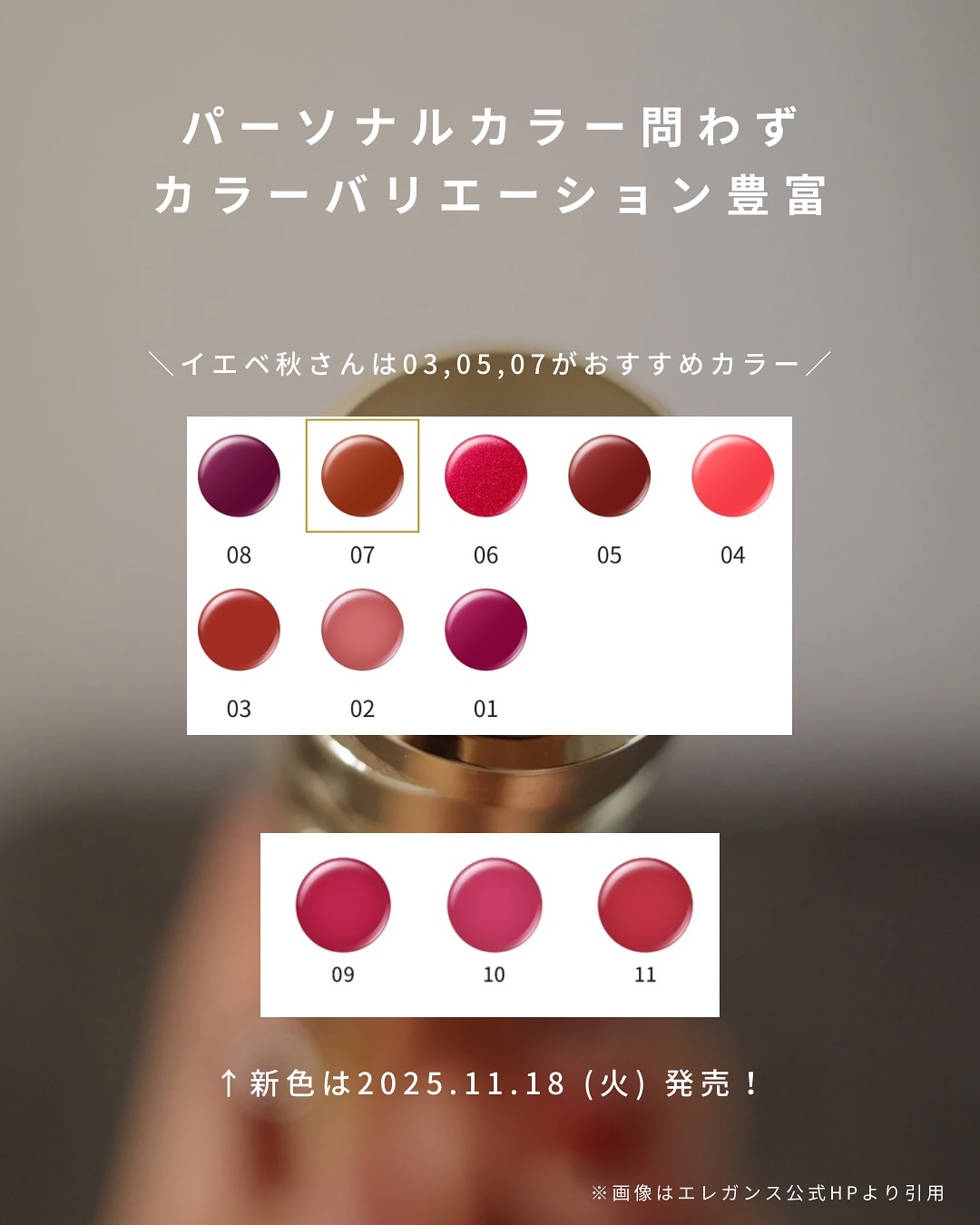元々発色がいいというエレガンスのルージュが気になっててついに購入しました!! 07は意外に私の元々の色にも合っていたのでイエローベージュを買ってみました! 深みのあるベージュで今からの季節にピッタリな色になってます!