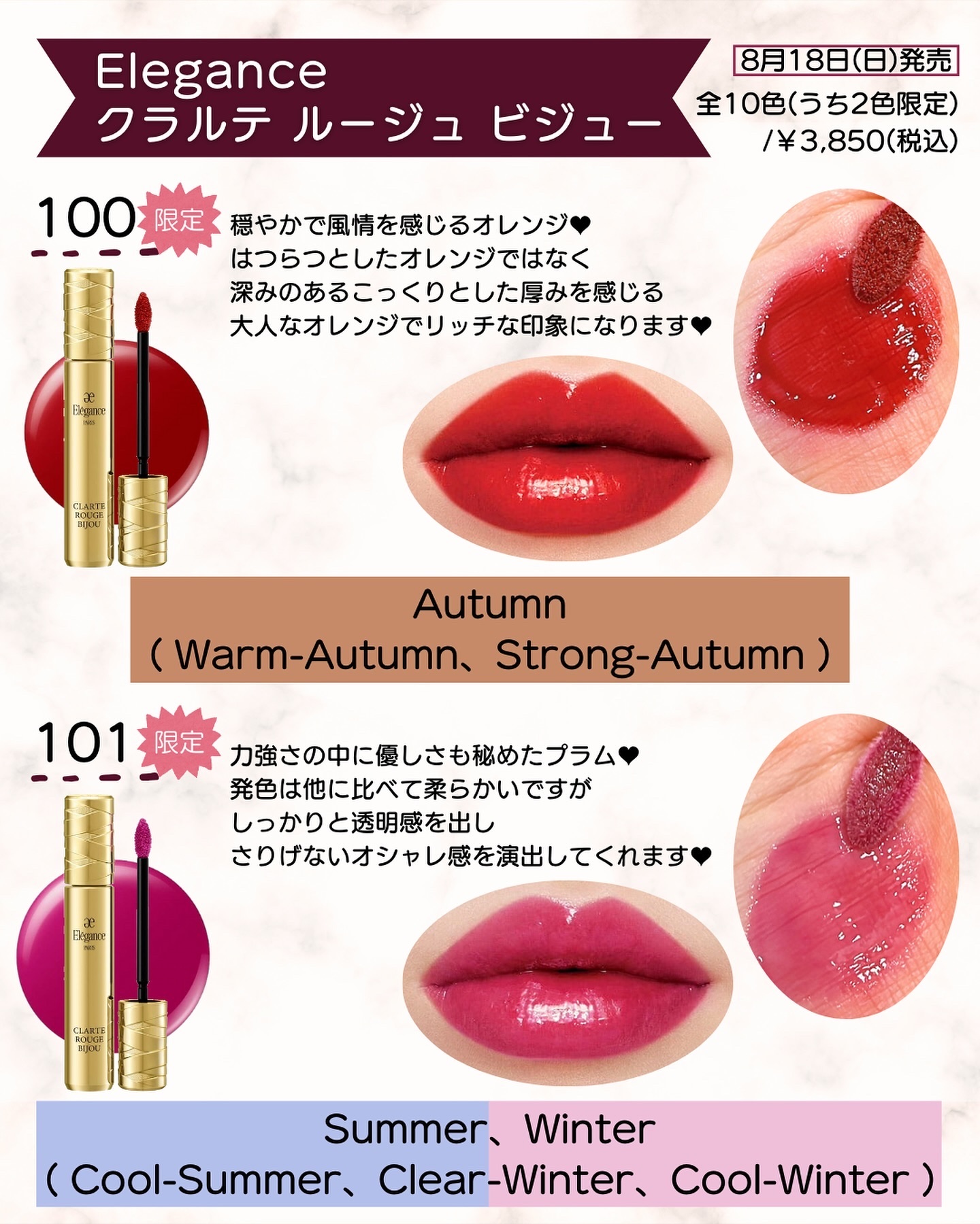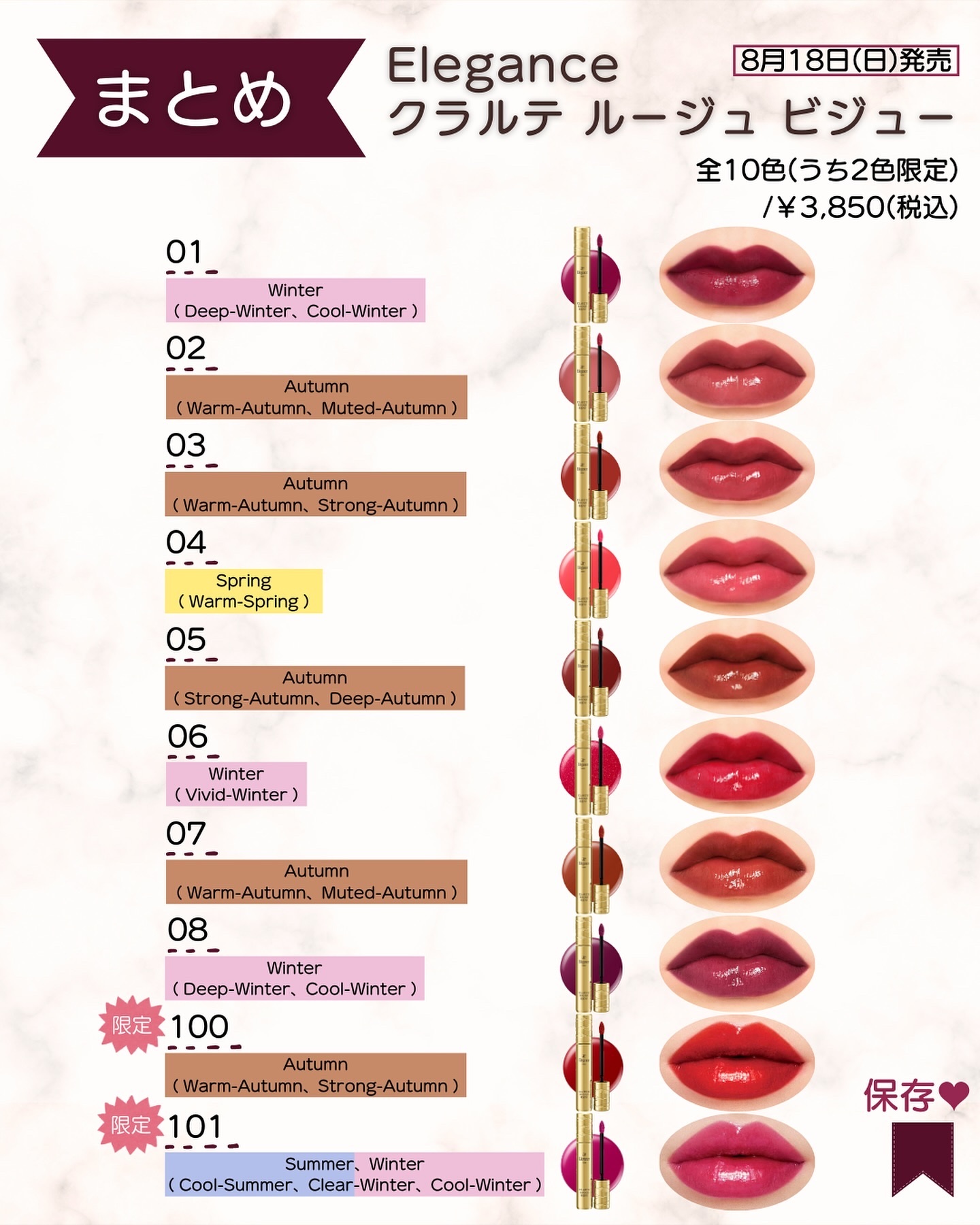 あゆみみ❤︎です🩷パーソナルカラーやコスメの耳より👂🏻な情報を16タイプ・パーソナルカラーアナリスト®のプロの視点からご紹介していきます!...本日は【パーソナルカラー仕分けEleganceクラルテルージュビジュー】についてお話ししていきます🌸✼••┈┈••✼••┈┈••✼••┈┈••✼••┈┈••✼《#Eleganceクラルテルージュビジュー》全10色(うち2色限定)/¥3,850(税込)@elegance_cosmetics✼••┈┈••✼••┈┈••✼••┈┈••✼••┈┈••✼あのEleganceのブリリアントルージュビジューが8月18日(日)にクラルテルージュビジューという名前でパワーアップしました🩷保湿感、色持ちが良くなり、これ1本あれば他にはなにも持ち歩かなくても大丈夫🩷すごく万能なラインナップです💄✨限定2色含めた全10色すべてをパーソナルカラー仕分けしてみましたのでぜひ保存して参考にしてみてください🩷✼••┈┈••✼••┈┈••✼••┈┈••✼••┈┈••✼【01】🩷Winter(Deep-Winter、Cool-Winter)にオススメ❤︎【02】🤎Autumn(Warm-Autumn、Muted-Autumn)にオススメ❤︎【03】🤎Autumn(Warm-Autumn、Strong-Autumn)にオススメ❤︎【04】💛Spring(Warm-Spring)にオススメ❤︎【05】🤎Autumn(Strong-Autumn、Deep-Autumn)にオススメ❤︎【06】🩷Winter(Vivid-Winter)にオススメ❤︎【07】🤎Autumn(Warm-Autumn、Muted-Autumn)にオススメ❤︎【08】🩷Winter(Deep-Winter、Cool-Winter)にオススメ❤︎【100】限定🤎Autumn(Warm-Autumn、Strong-Autumn)にオススメ❤︎【101】限定🩵Summer、🩷Winter(Cool-Summer、Clear|Winter、Cool-Winter)にオススメ❤︎✼••┈┈••✼••┈┈••✼••┈┈••✼••┈┈••✼フォローして他の投稿も見てみてください🩷@ayumimi_color👈🏻✼••┈┈••✼••┈┈••✼••┈┈••✼••┈┈••✼ラピスの16タイプカラーメソッド®に基づくアナリストの個人の見解です...7月より長野駅周辺で16タイプ・パーソナルカラー診断を開始いたします🌈(現在ご予約一時休止中です)ご予約・詳細はハイライトをご覧ください📱✨️#パーソナルカラー#パーソナルカラー長野#16タイプパーソナルカラー#16タイプパーソナルカラー診断#イエベ春#ブルベ夏#イエべ秋#ブルベ冬#イエベ#イエローベース#ブルベ#ブルーベース#パーソナルカラー診断長野#16タイプパーソナルカラー診断長野#16タイプパーソナルカラー長野#パーソナルカラー診断長野#長野市#コスメ#コスメ購入品#コスメオタク#コスメ大好き#コスメ大好きさんと繋がりたい#メイク#デパコス#プチプラコスメ#プチプラ#エレガンス#クラルテルージュビジュー