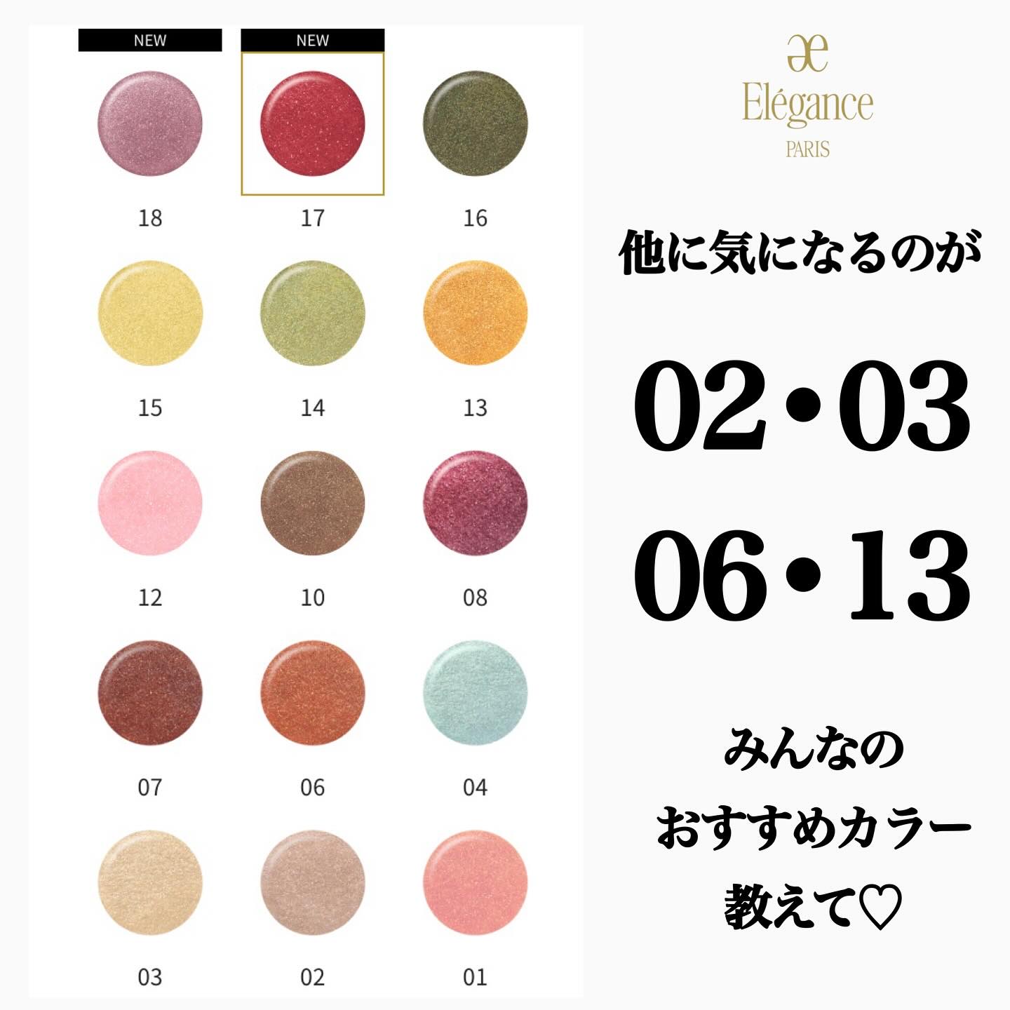 ぷるんとジュレがまぶたにフィット。 輝きとツヤめく色がつづくアイカラー 17は、難易度高いピンクレッド使いこなせるように頑張ります。 18は、秋の新作らしい、こっくりモーヴカラーです。