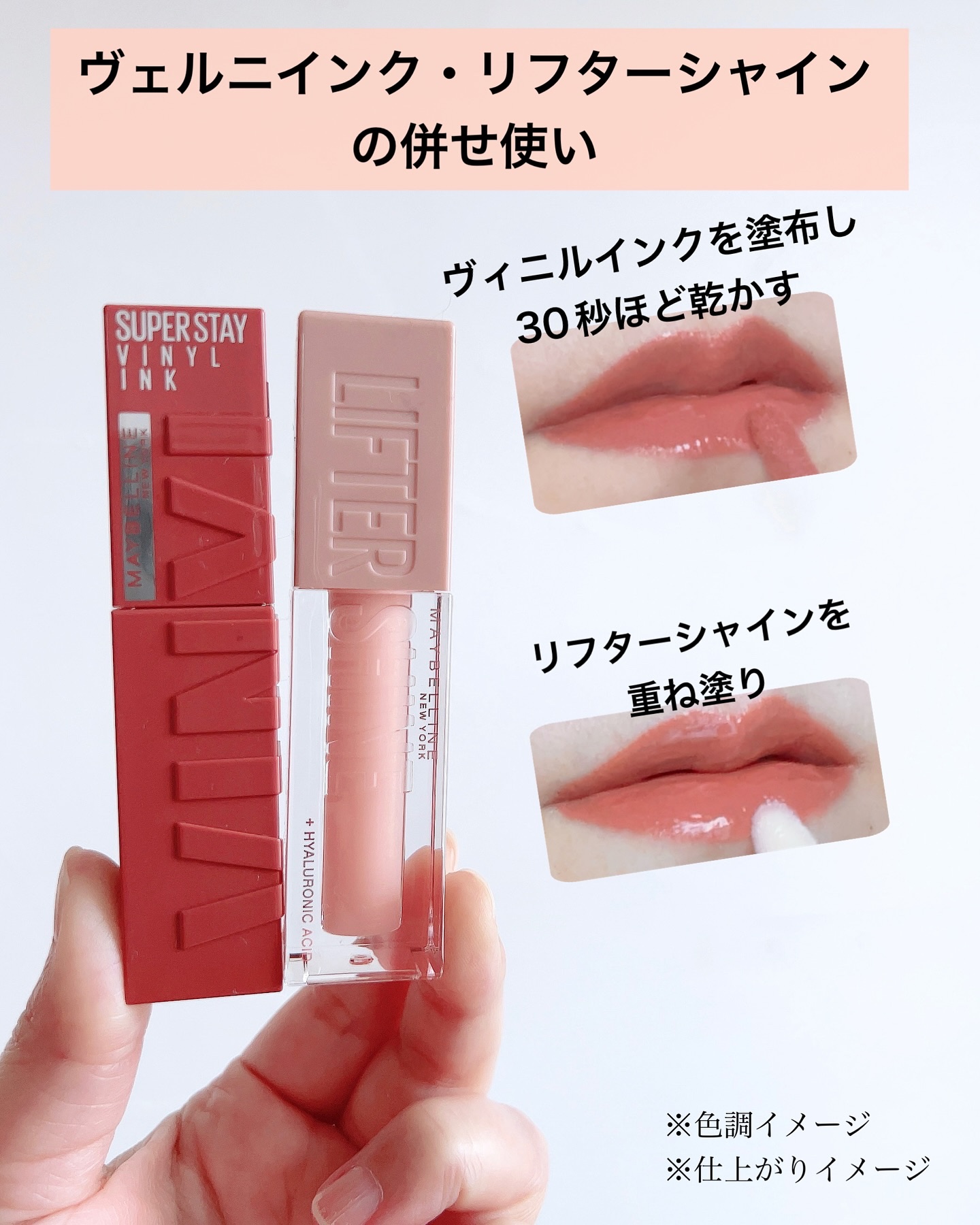 いつも投稿をご覧頂きありがとうございますMAYBELLINENEWYORK@maybellineSPステイヴィニルインクリフターシャイン可愛いぷっくり唇が作れちゃうメイベリンニューヨークと大人気リップアイテムを紹介するよ😊⋆✦SPステイヴィニルインク各¥1,991(税込)メイベリンのとにかく色が落ちないことで有名なヴィニルインクに桃カラーが登場🍑このリップの1番の特徴は色持ちの良さ!!ブランド独自のトリプルロックフォーミュラで色・ツヤ・仕上がりをロック!!使う前にシャカシャカ振ることで膜形成成分*1と高濃度ピグメント*2が混ざって仕上がりの長持ち効果が発揮されるの!!高発色なので1度塗りでしっかり発色してくれて、さらにムラになりにくいから誰でも綺麗に仕上がるよ😊今回登場するピーチコレクションの中で特におすすめのカラー3色を紹介!!🍑15甘美なピーチベージュ(限定色)肌なじみのいいヌーディーなピーチベージュカラー🍑67甘酸っぱいプラムピンクパープルを1滴混ぜたような大人可愛いレッドカラー🍑66水蜜ピーチピンクほんのり赤みを感じる深みピンクブラウンカラー食べても飲んでも色が落ちず、塗りたての仕上がりが持続するまさに最強リップ💄!………………………………………………………………⋆✦リフターシャイン002アイシーピンク¥1,991(税込)うるおい膜で唇をラッピングしてぷるっぷるな唇に、ヒアルロン酸配合のグロスプランパー✨️86%ケア成分配合で唇が荒れやすい方でも使いやすい!!今回頂いた002アイシーピンクは唇をなめらかに魅せるシアーなピンクカラーで血色感のあるボリューミーな唇に♡繊細なラメがたっぷり入っているけど、実際に塗るとあんまりラメ感は感じないので普段使いにも良さそう😊プランパータイプのリップだけどそこまで刺激はなくほんのりスースーするくらい!!ステイヴィニルインクを塗り縁をぼかし、30秒程乾かして上からリフターシャインを塗ると可愛い桃リップが作れるよ😊SPステイヴィニルインク&リフターシャインは全国のバラエティストアやドラッグストア、そしてAmazon、楽天、Q0010などのECサイトで購入できるよ!!*一部店舗で取り扱いがない場合があります気になる方はぜひチェックしてみてください!!*1トリメチルシロキシケイ酸、ポリプロピルシルセスキオキサン、アルキル(C30-45)ジメチルシリルポリプロピルシルセスキオキサン、ポリメチルシルセスキオキサン/トリメチルシロキシケイ酸*2メイベリン従来品(ウォーターシャイニーボリューミーパール)と比較において、3倍のピグメントを配合#PR#メイベリン#maybellinenewyork#メイベリンニューヨーク#コスメ#コスメレビュー#コスメレポ#コスメ紹介#コスメ好き#コスメ垢#コスメマニア#コスメ情報#リップ#リップティント#リップメイク#メイベリンリップ#桃リップ#spステイヴィニルインク#リフターシャイン#ぷっくり唇#コスメ好きさんと繋がりたい#ドラコスこれ買って