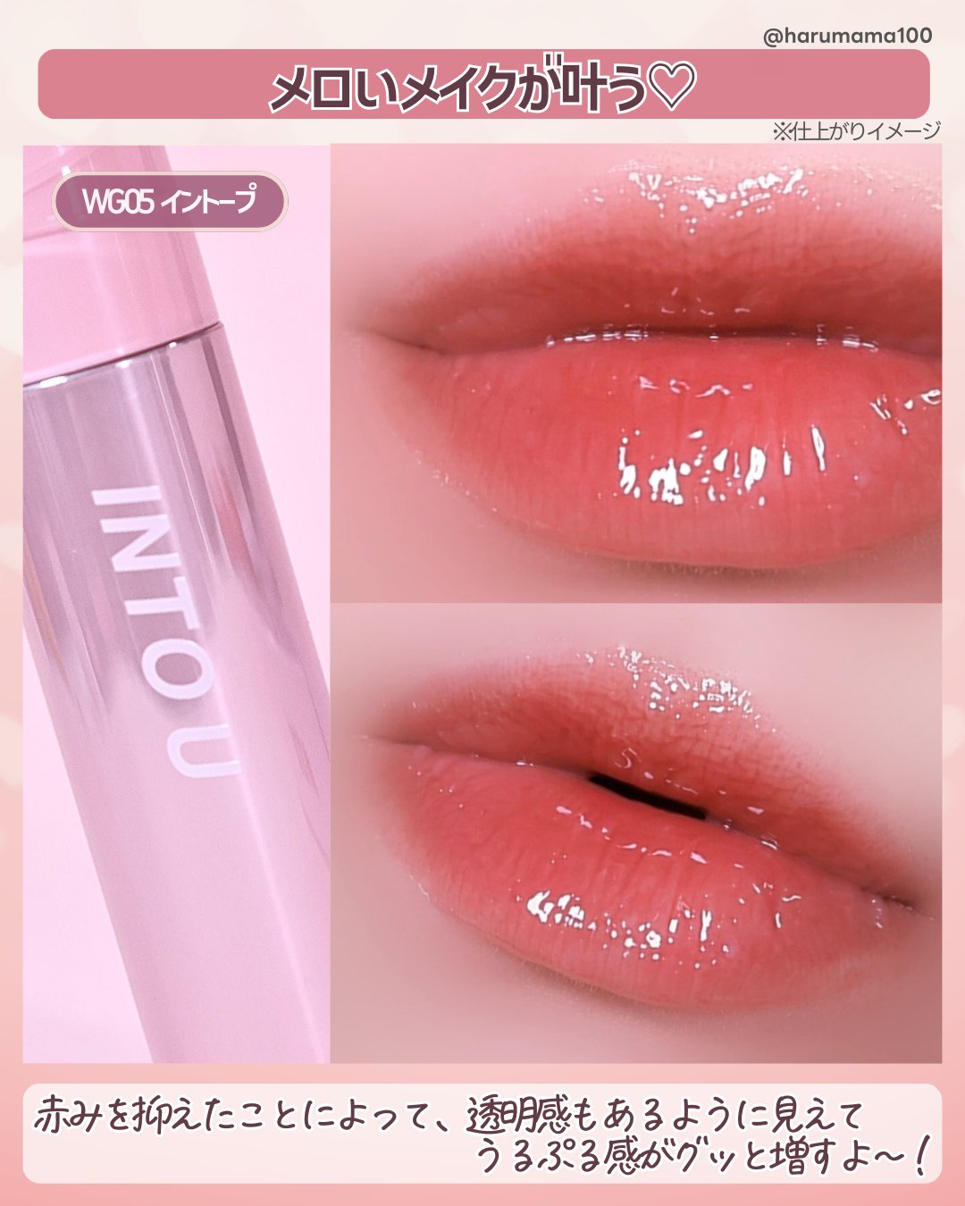 ちゅるちゅる感が可愛い くすみモーヴ INTO Uジューシーパンピンググロス WG05イントープ 透け感強めなので発色はナチュラルめ。色もちは良くないけどこのちゅるん感が本当に可愛い! さらっとしててベタつかず、他のリップに合わせるとすごい可愛いの!