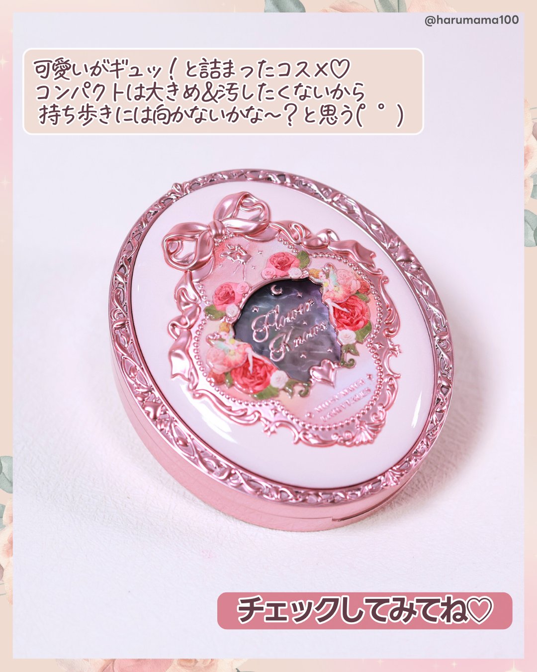 少女のような多幸感を頬に描くアートチーク。おとぎ話の1ページをイメージしたデザインだそう🧚♀️ 今までのフラワーノーズのチークより粉質がふんわりしているように感じました! フラワーノーズのアイテムの中でもトップクラスにパケが好み😭🤍🤍