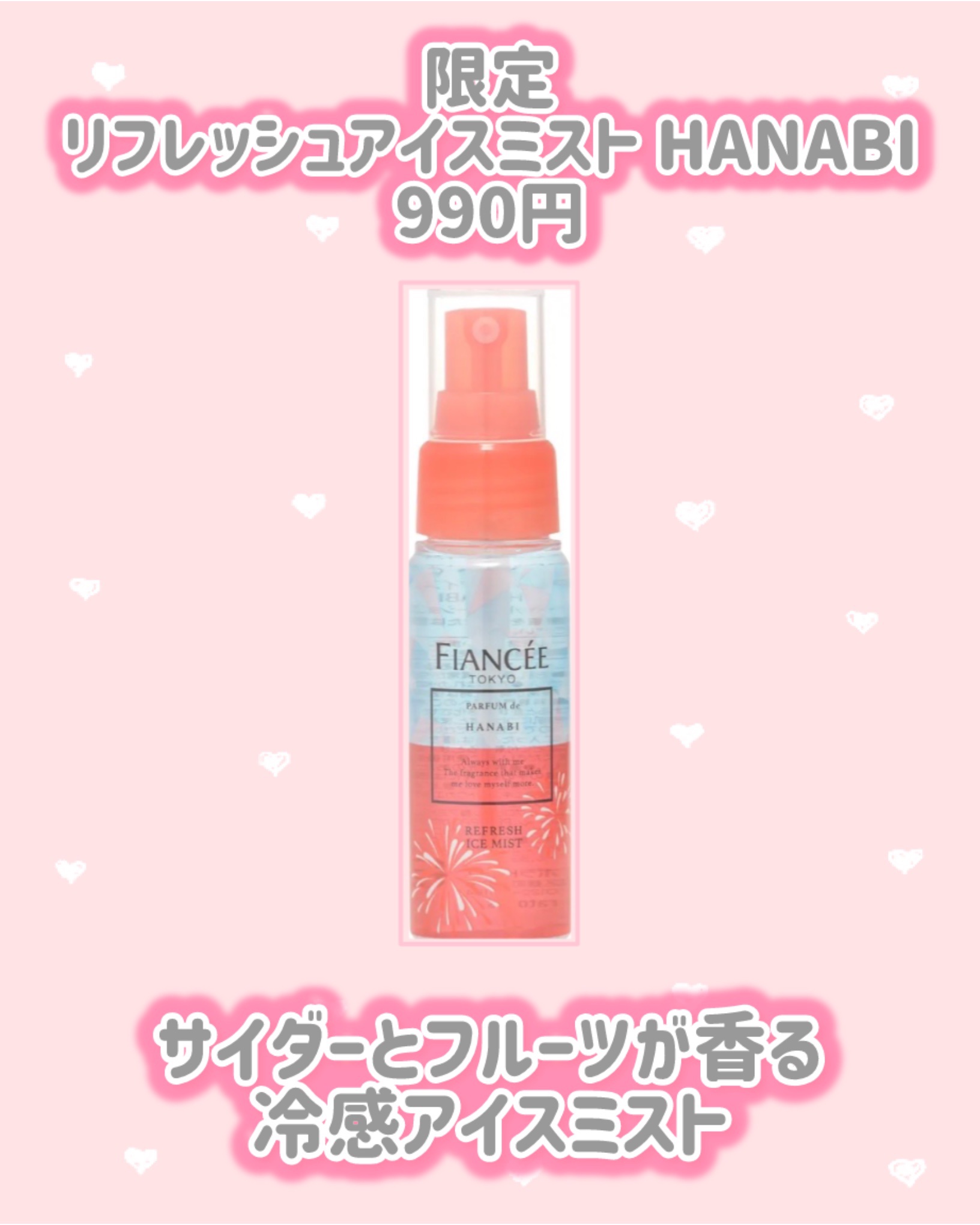 フィアンセ新作情報⟡.·*.··············································⟡.·*.発売日07/02香る冷感ミスト数量限定で販売♥限定ボディミストHANABI1.320円今だけ限定空にはじける花火...