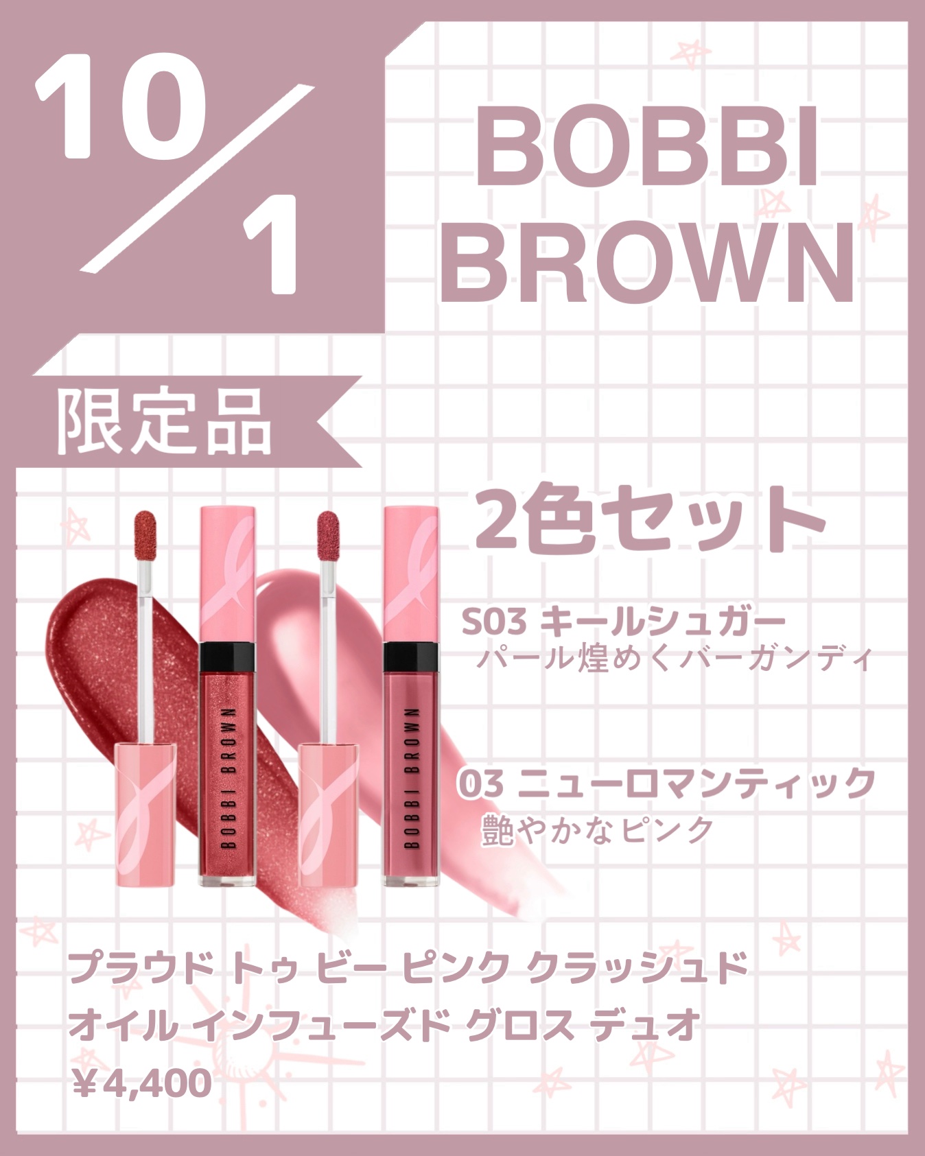今回の投稿はこちら⤵︎︎「第一弾10月1日-10日発売ピンクコスメ情報」■10月1日(火)発売【シスレー】フィトオンブルエクラリキッドNo.9プラム5,500円ーーーーーーーーーーーーーーーーーーー【アンドビー】シアーリップシェルピンク〈コラボカラー・限定〉2,200円ーーーーーーーーーーーーーーーーーーー【江原道(こうげんどう)】ミネラル3Dアイシャドウレイヤードローズ4,400円ミネラルルースチークピンクブロッサムシャインコーラル各¥3,850円ミネラルルースハイライターさくら3,850円ーーーーーーーーーーーーーーーーーーー【ボビイブラウン】プラウドトゥビーピンククラッシュドオイルインフューズドグロスデュオ¥7,920〈限定品〉■10月4日(金)発売【カネボウ】ルージュスクラブメルティングS00AnytimeClearS01BareRedEX1JoyfulBerry〈限定色〉各4,620円ルージュスターヴァイブラントEX7StarryCassisEX8FuchsiaDream各4,620円〈限定品〉※コスメ画像は、各公式サイトやLIPS様にてお借りしました。#シスレー#&be#KANEBO#KohGenDo#BOBBIBROWN#10月新作コスメ#新作#ピンクコスメ