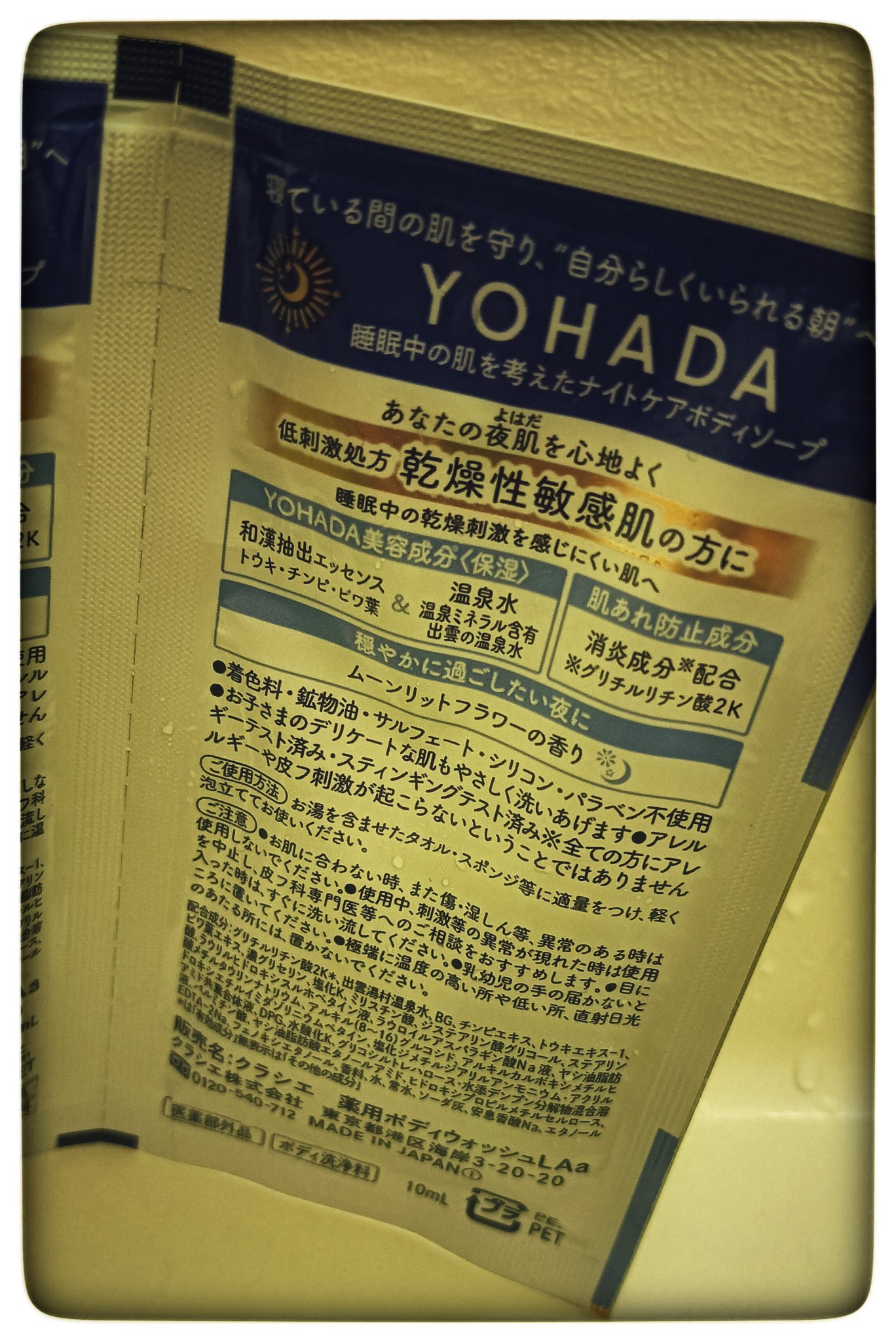 YOHADA ボディウォッシュ[医薬部外品]を使用しました😊睡眠中の肌を考えたナイトケアボディソープになっております✨乾燥性敏感肌の方に、睡眠中の乾燥刺激を感じにくい肌へ。着色料、鉱物油、サルフェート、シリコン、パラベンはフリー処方です。クリーミーなテクスチャーで泡立ちもよく洗えます。洗い流した後はしっとりすべすべ肌になりました。ムーンリットフラワーの香りがリラックスさせてくれます。今回はサンプル使用ですが、ボトルも買って使用してみたいです。