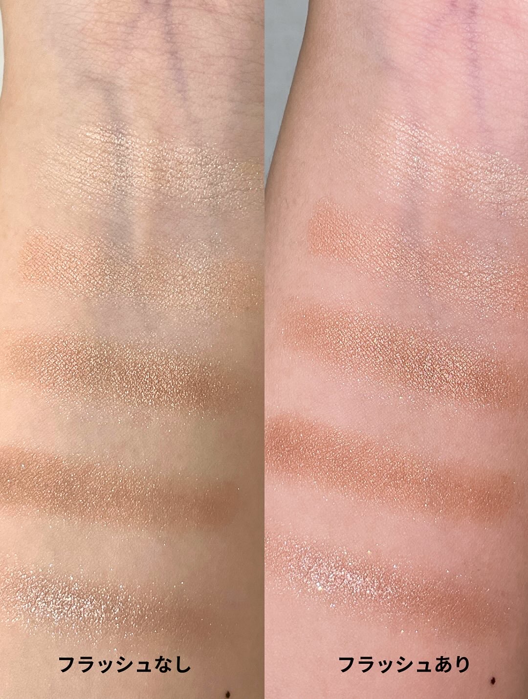 インウイ08は目よりも、スウォッチよりも、ツヤツヤ具合、キラキラ具合、スモーキーに寄り過ぎずブワッて発光するけど白飛びしないところなどすべてが微妙なニュアンスの色&質感がしっかり出てヤバ!!!!! 海外コスメのヌメッとした影の入った色合いとか華やかさが好きだけど流石に最近買うものないなって感じの心の溝を埋めてくれる感じだと思った、それが陽の光(?)なところが新鮮だし インウイの下段の濃い目の色に良い感じに細かい多色キラキラが入ってるんだけど、多色キラキラなのに可愛らしい感じに転びすぎないところも良い