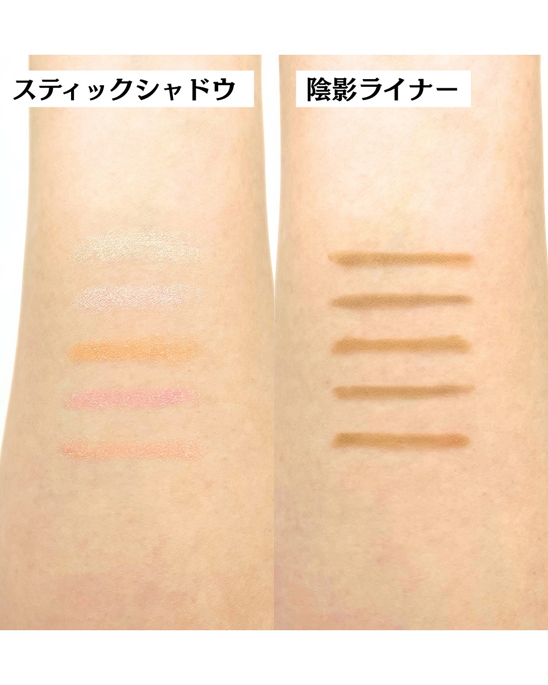 素早くフィクシングして長時間持続する ◯陰影ライナー 涙袋の陰影、アイブロウ、アイラインまで 多角度からふんわりと輝く ◯スティックシャドウ ラメ感めっちゃ可愛いー! 中顔面短縮効果で血色感あるベビーフェイスに仕上がるよー