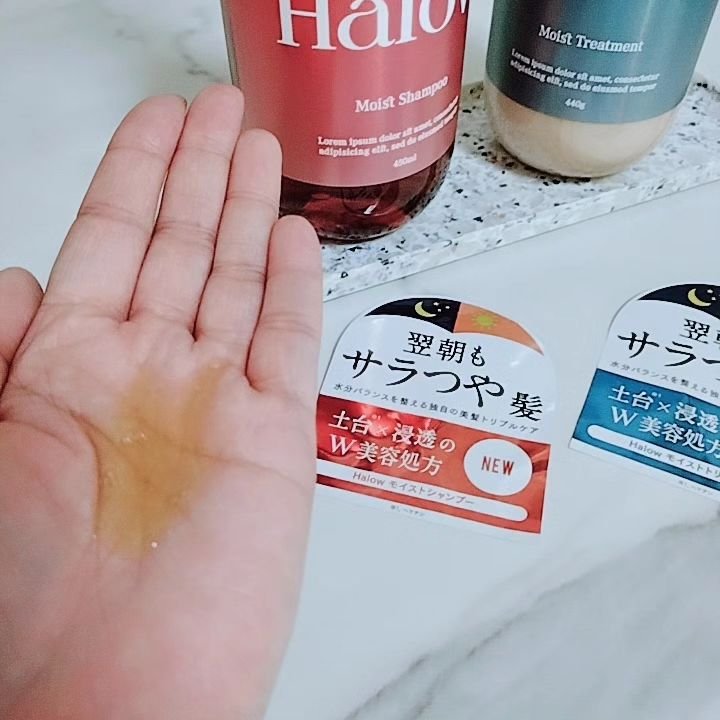 Halow モイストシャンプーHalow モイストトリートメント90%以上の美容液成分(水を含む)配合なので髪にうるおいを与えてくれる事が期待出来るそうですヘマチン、ヒアロベール®︎(保湿成分)、ケラチン、ヒートケア成分配合で、補修ケア・浸透*保湿ケア・ダメージケアが期待出来るそうです*髪の内部まで○Halow モイストシャンプー見た目は少し茶色っぽいトロミがしっかりしたシャンプー、泡立ちはふんわり、アミノ酸系洗浄成分のシャンプー、ノンシリコンシャンプーですがきしまず洗い心地が良いです、フルーティームスク香りはふんわりで強すぎない私好み○Halow モイストトリートメント薄い茶色っぽいトリートメント、程よいなめらかさがあり、髪に馴染ませると毛先までスルーっとする指通りに、うねり、パサつき、ゴワつきを整えてくれるそうです