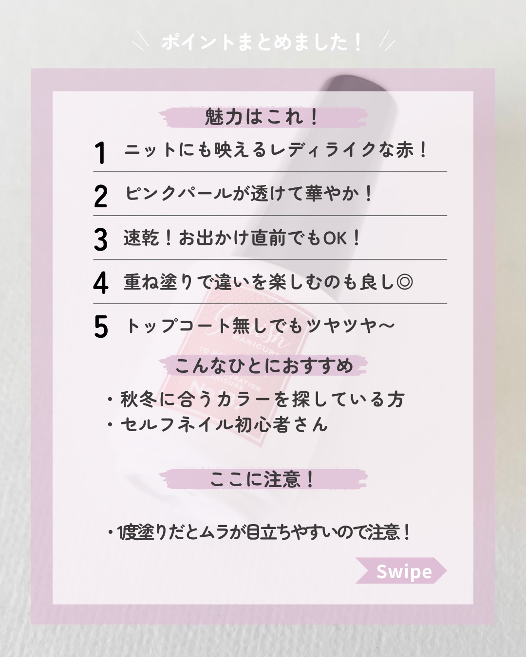 秋冬ニットに映えるレディな赤が出た!ライト要らずで手軽にジェル風ネイルが楽しめる、ジーニッシュのマニキュア。2025年秋の新色のひとつにブリックレッドカラーの「137カーロドルチェ」が登場!ジーニッシュ 137カーロドルチェ 1,210円(税込)「137カーロドルチェ」は、深みのあるブリックレッドカラー。ベリーを思わせるような色味とつやんつやんの仕上がりが◎!2度塗り&トップコートなしでこれは凄すぎない??2度塗りすれば、ニットなどの装いにコントラストをつけてくれるような、ツヤと発色が楽しめます!レディライクにキマる垢を探している方は是非!#セルフネイル#ジーニッシュマニキュア#ジーニッシュ#秋ネイル#プチプラネイル#大人ネイル#冬ネイル#秋の先取りコスメ