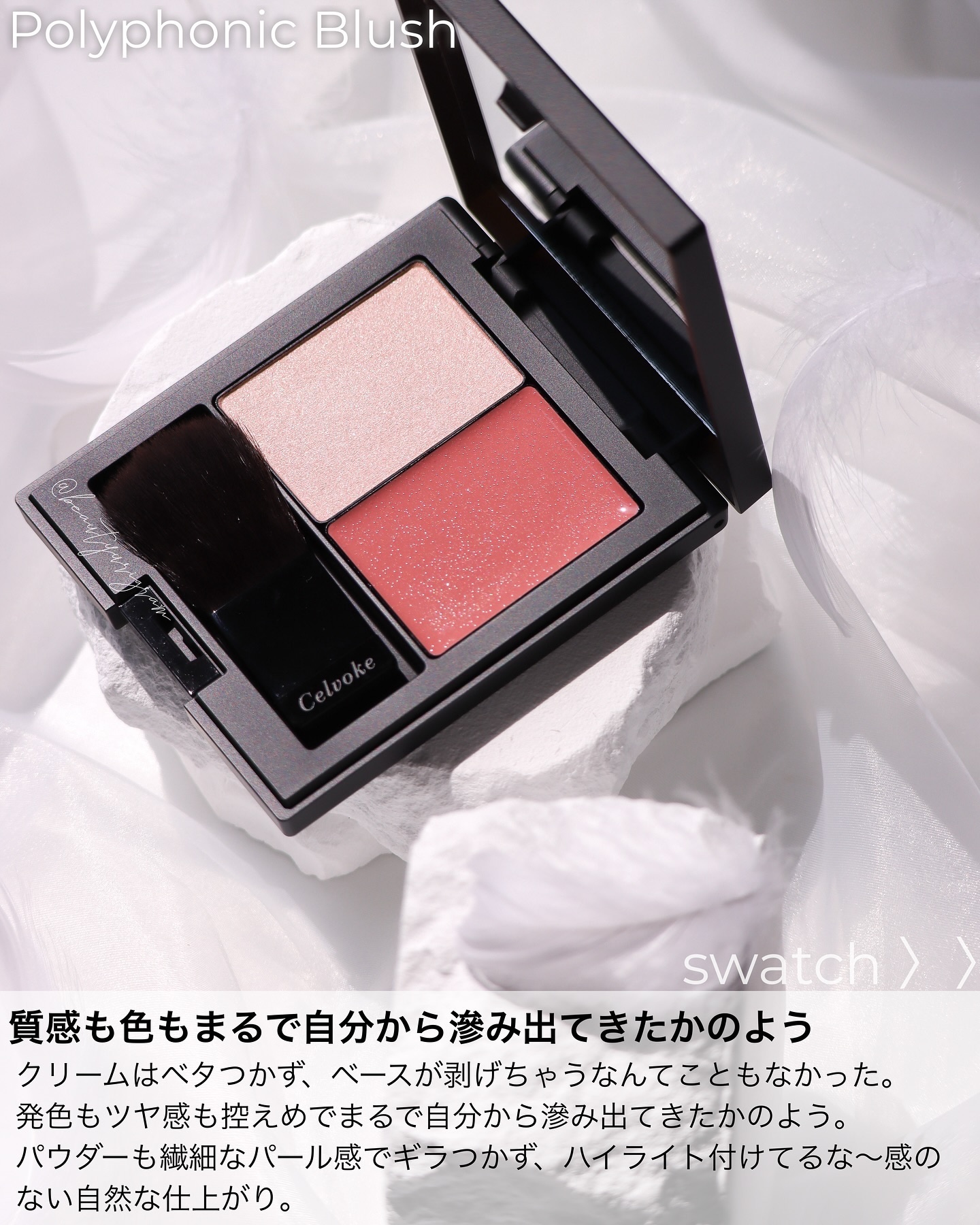 《8/9全国発売》すっぴんすら可愛くなるじゅわっと上気ほっぺ♡【Celvoke】@celvoke.jpポリフォニックブラッシュ■color:05TaffyPink-——————————————————————[5.5g/¥5,390(税込)・新色2色(うち限定1色)]※商品詳細は画像に✍️※Celvoke様より商品を頂きました-——————————————————————❃こんな方におすすめ❃・すっぴんでも盛れるチークを探している・可愛いもいいけど大人のラフさも欲しい・自然な血色感の出るチークが好きCelvoke秋コスメ!展示会にご招待頂き商品を頂いたのでレビューしていくね🥹💗これは実物見てから惚れた!って人の方が多いかも🥹みんな受けしそうなブラッシュだよ♡《使用感》クリームだけどベタつかずベースが剥げちゃうなんてこともなかった!《機能》■05タフィーピンク:シルバーパールが煌めくピンクのパウダーに、シアーなローズピンクのクリーム。 控えめな発色でほんのり上気したような印象に。→自分から滲み出た血色感といった感じ✨ これ誰でも使いやすい色なんじゃないかな!?😳→[左:パウダー] 公式には“ピンクのパウダー”とあるけど 言われたらピンク感あるかも…?というくらい🤔 でもたしかにシルバーパールのおかげで パレット上で見るよりも黄みが少なくニュートラルで 色変化もなく・白浮きせずにパール感だけ足せる🙆♀️ [右:クリーム] コーラル寄りなピンクだけど黄みに寄りすぎず 肌馴染みの良いカラー。 すっぴんにもめっちゃ可愛い!🥹✨▷質感:かなり自然なツヤ クリームってツヤツヤになりすぎる!ってケースあるけど これはかなり自然! パウダーの方もギラつくことなく ハイライト付けてるな〜感のない自然な仕上がり。▷発色・持続性 ポリフォニックブラッシュの中では 05は発色強めタイプだとは思うけど 一般的に言うと少し薄めかな🤔 付けた直後よりもどんどん馴染んでくるので 外出の際わたしは持ち歩いてる! これは失敗しにくいと思う!《まとめ》ツヤ系チークって色々出てるけどCelvokeのはピュアさもありつつお洒落感も損なわれないからやっぱり他とは一味違うな〜🥹✨このチークを主役にしたナチュラルメイクも個人的には可愛いと思う♡**#celvoke#セルヴォーク#ポリフォニックブラッシュ#新作コスメ#アラサー美容#アラフォー美容#垢抜けメイク#セルフケア#撮影代行