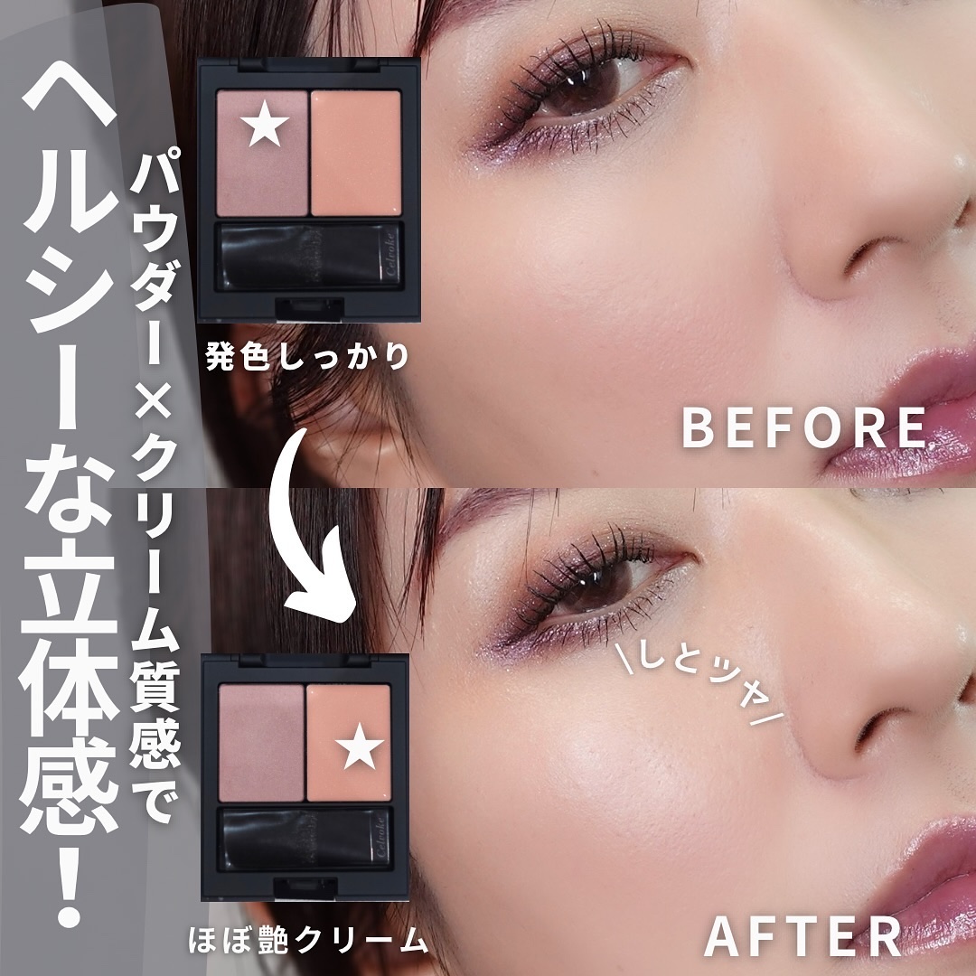 質感MIXが面白いコチラ💁 いつも配色が可愛いパウダー&クリーム質感チークの秋限定色! ハイライター的艶クリームは、本当色は気持ち程度!色で立体感を出すというよりピーチニュアンスの濡れツヤでよりナチュラルでヘルシーな立体感🧏♀️ 大人っぽいくすみカラーにこのヘルシーな艶の組み合わせ。なんかちょっと意外だった🤭