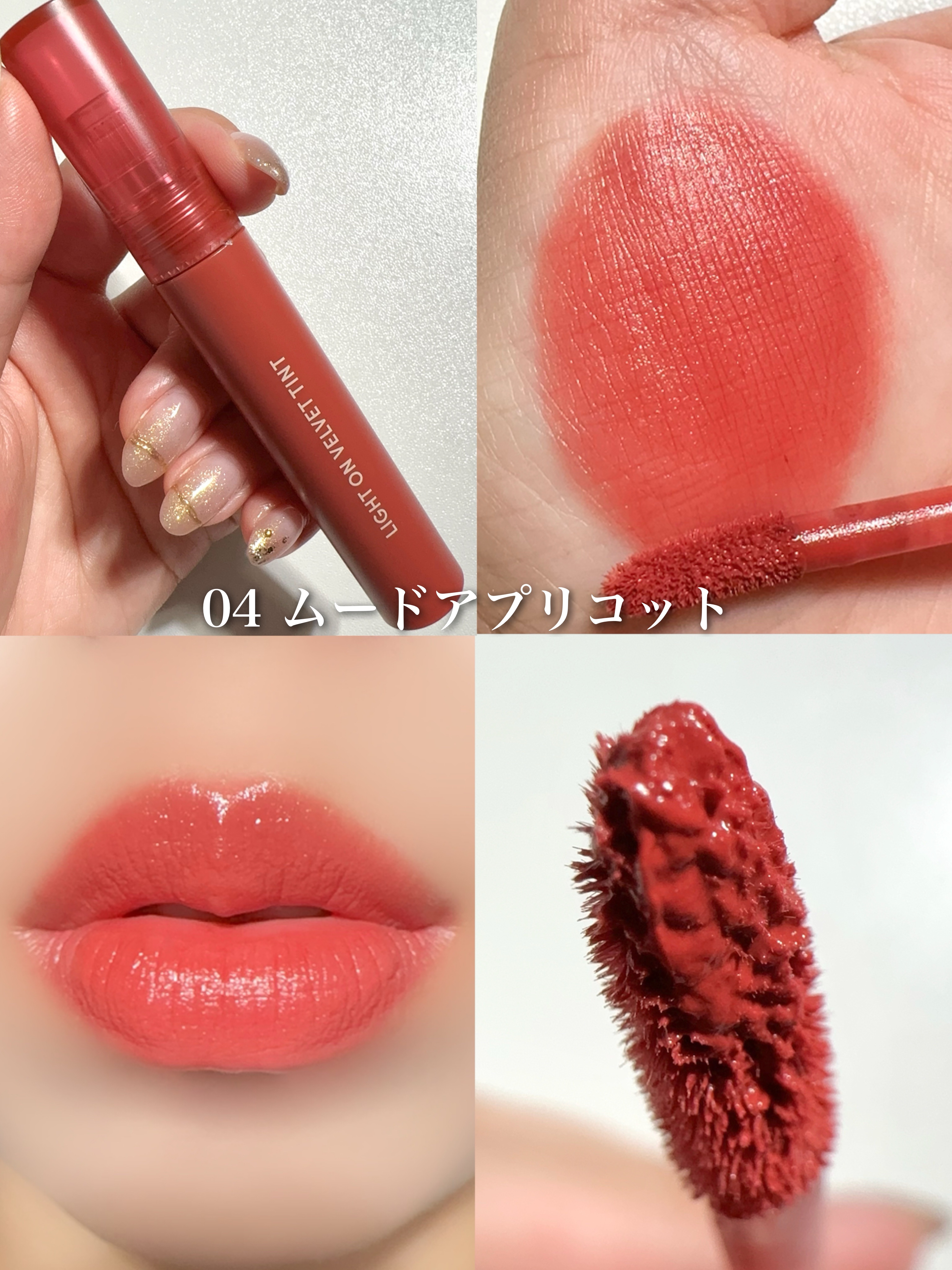 ふわふわ感がめちゃくちゃ可愛い/ライトオンベルベットティントネイチャーリパブリックライトオンベルベットティント¥1590(税込)ふわふわなスフレ質感のマットティントリップ。一般的なティントほど唇染めてる感はなく、ティントには色もちも劣るけどティント特有の時間とともに赤み強くなったりがないところが良き。あとマットリップあるあるの乾燥感やパサつきも感じず使いやすいリップ。ふわっとしててぼかしやすくすごく綺麗に色のる。絶妙な色がどれも可愛く、単色で使っても他のリップと合わせても可愛いの!!!ただマスクやコップにはめちゃくちゃつくから、そこが嫌な方はいると思う!今回10本比較だすのにあたりなるべく同じ条件で撮影するため、軽めにリップクリーム塗った後軽くティッシュオフしてから撮ってます。そのため実際の質感より少しツヤ感プラスされてると思います。どれも過去に提供いただいたものだけど、PRとは関係なく勝手に全色比較だしてます。#冬のほてり顔メイク
