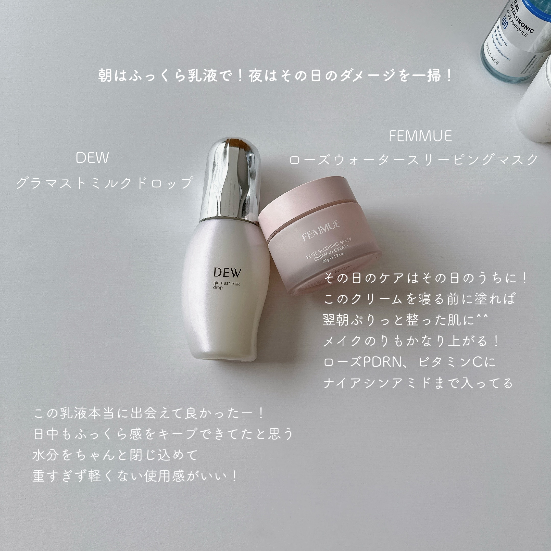 【スキンケア】朝はDEWグラマストミルクドロップ夜はFEMMUEローズウォータースリーピングマスクスキンケアの最後のアイテムどちらもとってもお気に入り☺️♡#UVダメージメンテ術#リピートスキンケア