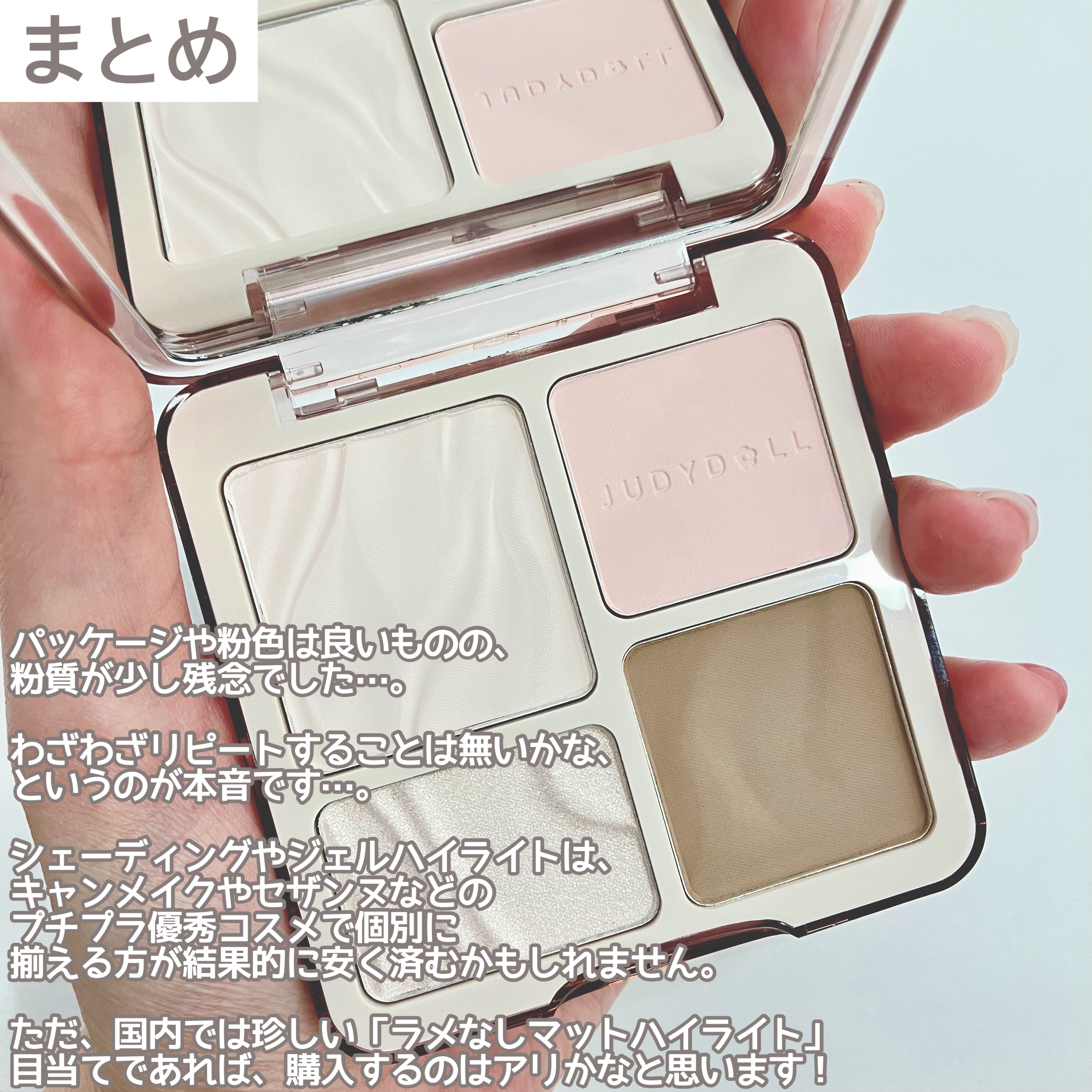 【正直レビュー】マットハイライト難民必見💡JUDYDOLLのバズりパレット、実際どう?🤔✼••┈┈••✼••┈┈••✼••┈┈••✼••┈┈••✼ラメのないマットハイライトを求めて…💡SNSで話題の捨て色なしパレット、実際はどうだった?マットハイライトを探していたところ、こちらのJUDYDOLL(ジュディードール)の「メリハリマスターパレット#04Nニュートラルトーン」を見つけました!マットハイライト目当てでしたが、他の色も捨て色なしでこれ一つで陰影は全て網羅できる優れもの✨LIPSベストコスメ2025部門賞マルチパレット部門1位というのもあり、期待値は高めでした。ただ、正直「うーん?」と思う点もあったので、良かった点・残念だった点も含めて正直レビューします✍🏻私はLIPSショッピングにて購入しました🛒✼••┈┈••✼••┈┈••✼••┈┈••✼••┈┈••✼【商品詳細】ブランド名:JUDYDOLL(ジュディードール)商品名:メリハリマスターパレット#04Nニュートラルトーン価格:2,090円(税込)内容量:9g✼••┈┈••✼••┈┈••✼••┈┈••✼••┈┈••✼【商品特徴・使い方】ニュートラルな血色ハイライトで柔らかい立体顔に✨パレット内の4色それぞれの役割はこちら👇🏻①マットハイライト:顔中央の三角ゾーンやほうれい線に。凹凸をふっくら見せる。②血色マットハイライト:頬にふんわり。涙袋にも!自然な血色感をプラス。③ジェルハイライト:鼻先や眉下に。主張しすぎない光を仕込む。④シェーディング:中顔面や顎に。立体感を出してスッキリ見せる。✼••┈┈••✼••┈┈••✼••┈┈••✼••┈┈••✼【使った感想・正直レビュー】ちなみに私の肌スペックは、混合肌で、パーソナルカラーはブルベ夏です。普段ファンデーションは標準色〜ワントーン明るめを使うことが多いです。💖良い点・おすすめポイント💖-これ1つで完結!:陰影を全て網羅できるので、お出かけの時の荷物が激減!初心者さんにも嬉しい🔰-捨て色なし:全色使える万能パレット。鏡付きなのも便利で、持ち歩きたくなる可愛さ💕-自然な仕上がり:⚪︎マットハイライトは陶器のような自然な光沢感。⚪︎血色マットハイライトは自然な血色感をプラス。⚪︎ジェルハイライトはシアーで主張が強すぎないキラキラ感。⚪︎シェーディングは自然な陰影を演出。☠️残念だったところ☠️-薄づきすぎる…:自分の肌色には合っているはずですが、マットハイライトもシェーディングも何度か重ねないと色が乗らない💦ナチュラルメイク好みの私でも、これは少し物足りない発色でした😢(写真では何度も重ねて撮影しています)-粉飛び&粉っぽさが気になる:特にシェーディングの粉飛びが気になりました。鏡側にも粉が飛ぶので、蓋を閉じるときは間に付属のフィルムをつけておくのは必須です。✼••┈┈••✼••┈┈••✼••┈┈••✼••┈┈••✼【まとめ】見た目は好みのパッケージ&粉色でしたが、正直なところ「粉質」が少し残念でした💦わざわざリピすることは無いかな、というのが本音です😭もしこの商品を買うなら、シェーディングやジェルハイライトはキャンメイクやセザンヌなどのプチプラ優秀コスメで一品ずつ揃えた方が、結果的に安く済むかもしれません💡ただ、国内の化粧品ではなかなか見つからない「ラメなしマットハイライト」目当てで購入するのはアリだと思います!✨✼••┈┈••✼••┈┈••✼••┈┈••✼••┈┈••✼#本音レビュー#正直レビュー#LIPSショッピング#JUDYDOLL#ジュディードール#メリハリマスターパレット#マットハイライト#シェーディング#ハイライト#中国コスメ#コスメ購入品#メイク初心者#ベースメイク#バズコスメ#バズりコスメ#LIPSベスコス使ってみた