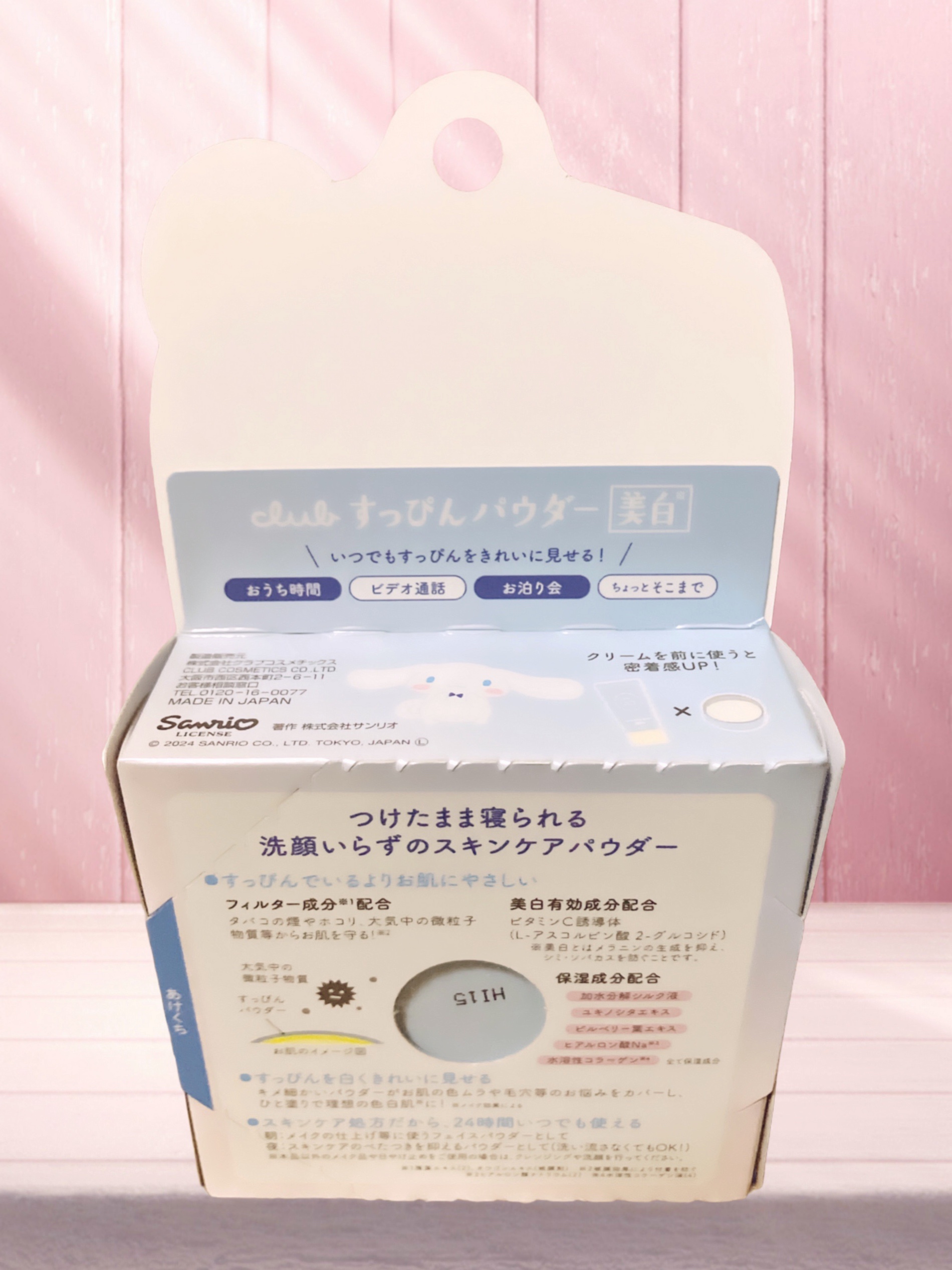 クラブ すっぴん ホワイトニングパウダーA シナモロール コラボ デザイン 数量限定 26g ¥1,980です。 ビタミンC誘導体が配合されているらしいです。クリアタイプなので、自然にトーンアップします!香りは、イノセントフローラルなので優しい香りです。 24時間いつでも使えるのが素晴らしい。スキンケア処方なのも嬉しいですよね。