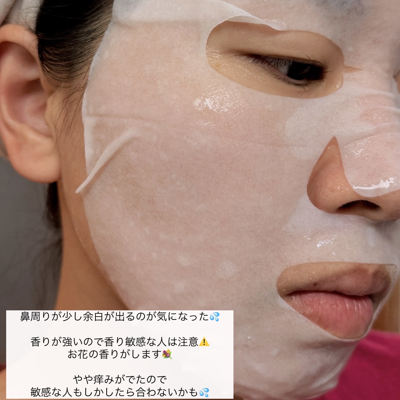 開封した瞬間に、香水のようなお花の良い香りがします😍 とても!!だから、それなりに好みは分かれそうですね🤔 柔らかくてよくフィットするシートで、サラリとした美容液がたっぷり入っていました。 美容液は肌に塗ると少しベタつきました。