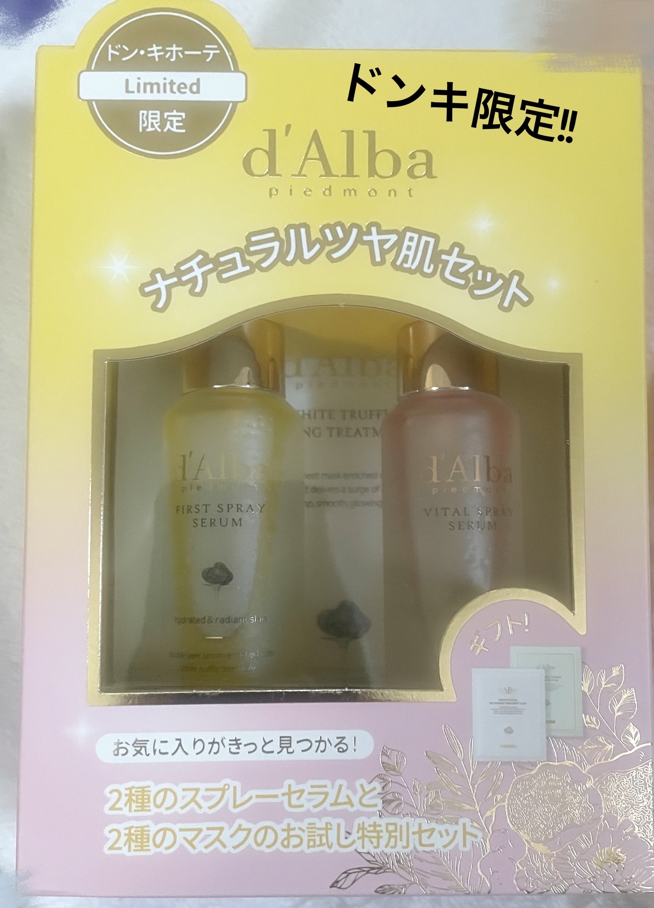 ☆購入品☆ダルバダルバホワイトトリュフファーストスプレーセラム/ダルバホワイトトリュフバイタルスプレーセラム50mlドンキに2種類のセラムとパックが入ったセットが売られていたので、黄色使ったこと無かったので、使うの楽しみです!「ダルバナチュラルツヤ肌セット」価格:¥2,600(税抜)商品:ダルバホワイトトリュフファーストスプレーセラム50ml/ダルバホワイトトリュフバイタルスプレーセラム50ml/トリートメントマスク/トリートメントマスクCC#ミスト#ドンキ購入品#ダルバ#シートパック#スキンケア#ミスト化粧水