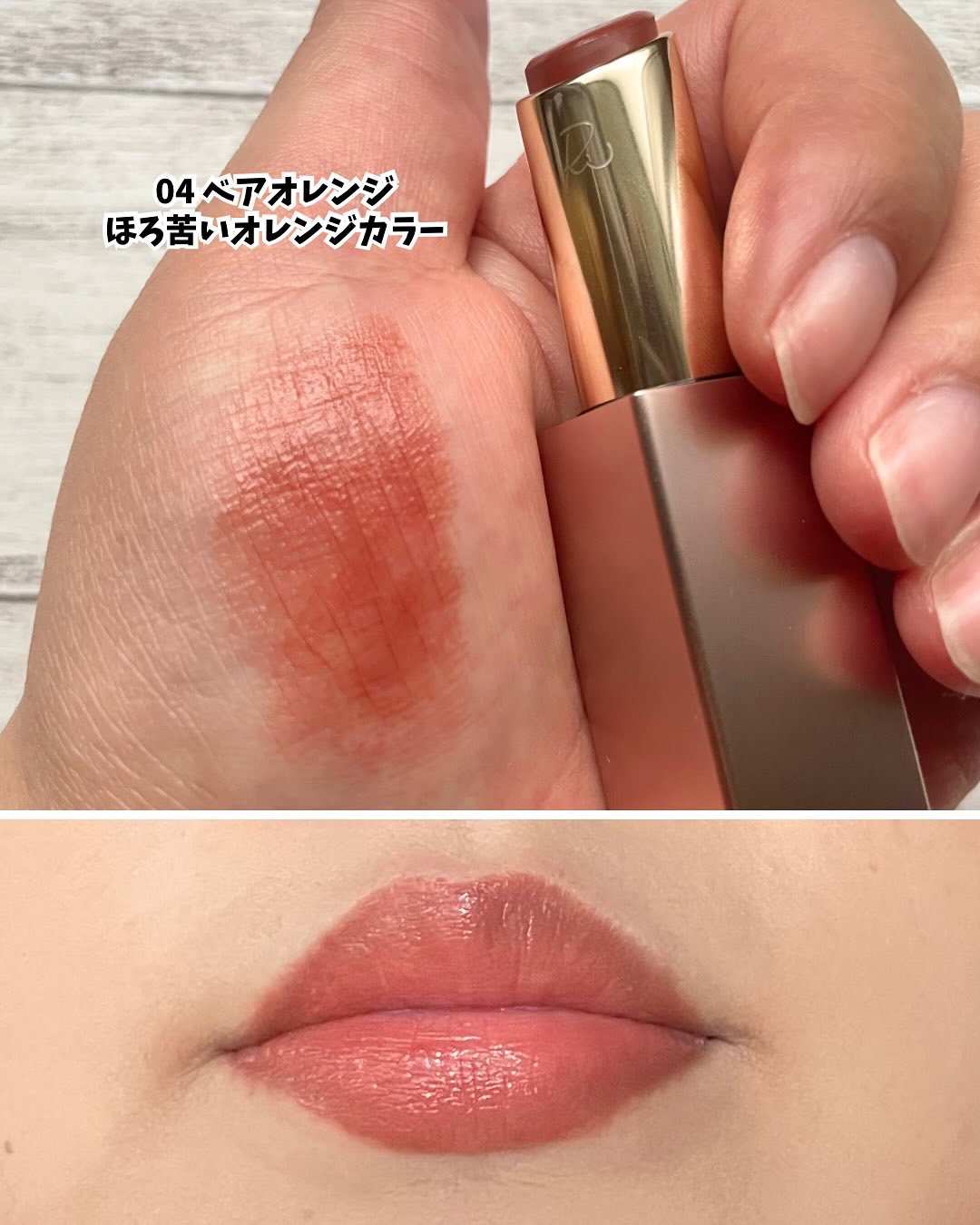 唇の温度で溶けてなじみ、塗りたての色・ツヤが持続するリップです。 04 ベアオレンジを使ってみました!上品なオレンジで、とても使いやすかったです。 唇にのせるととろけるような感触で気持ち良い!!パケもめちゃくちゃ可愛いし、持っているだけでテンションが上がりました!
