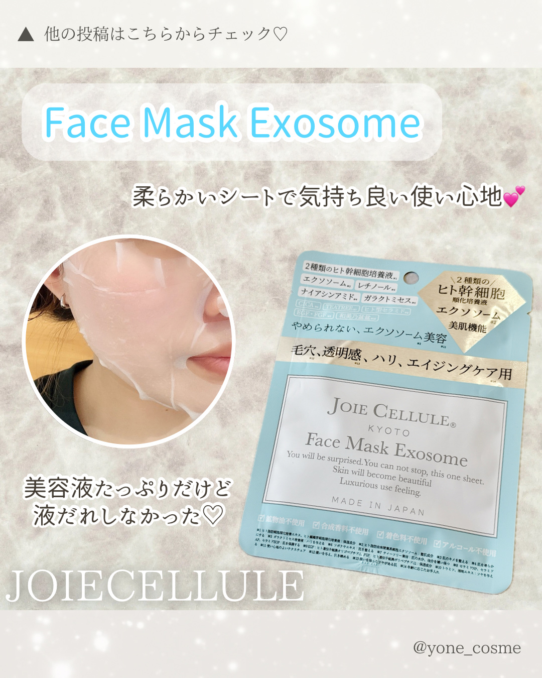 お目汚しございます。苦手な方は閲覧ご遠慮くださいませ。JOIECELLULEジョワセリュールフェイスマスクAZE友達がプレゼントしてくれました。ありがとうございます🥰厚手のシートで肌への密着も良く液がヒタヒタで気持ち良かったです。敏感肌の私で...