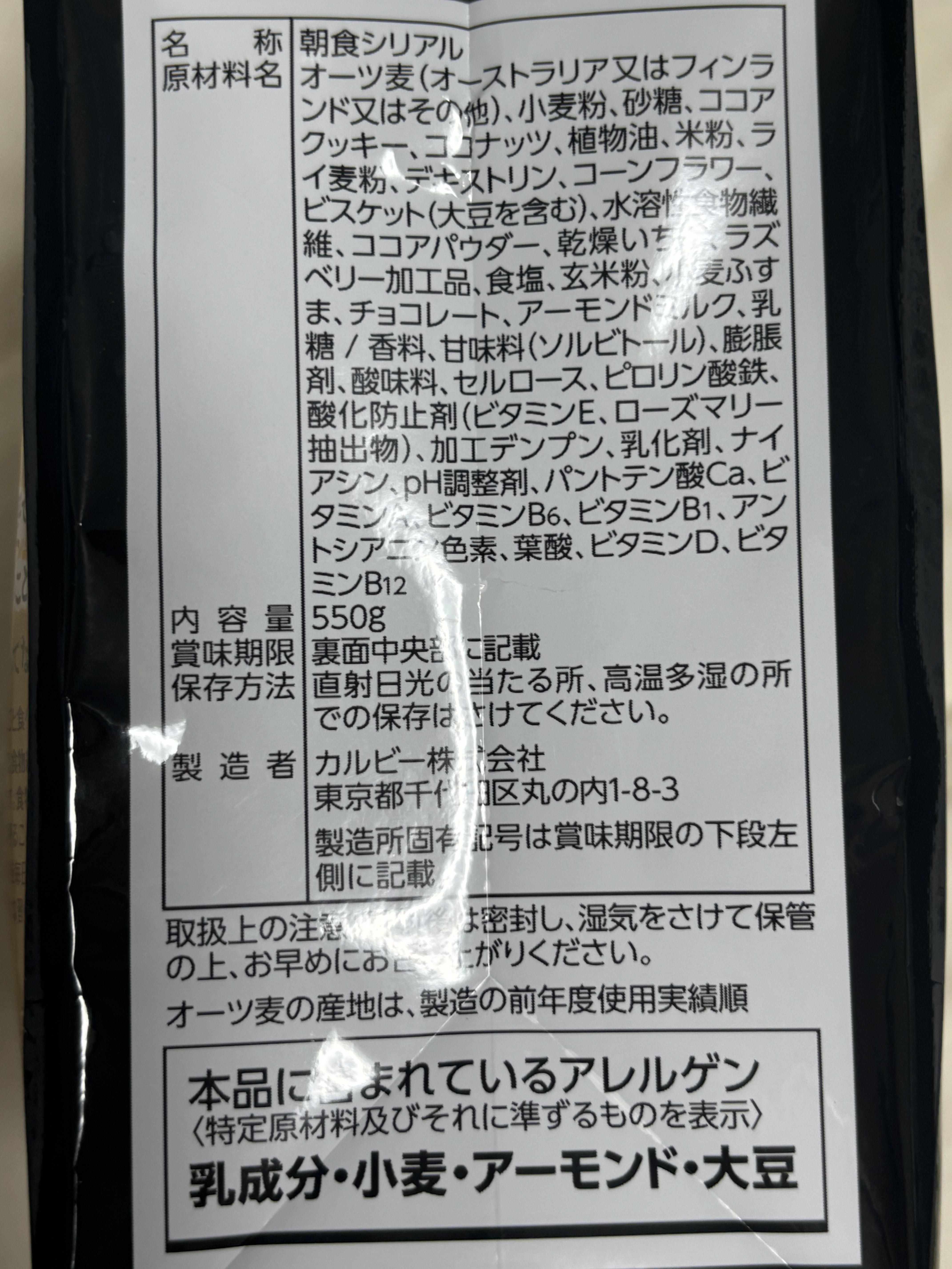 ついに買ったよ!数量限定フルグラ「フルグラ ブラックサンダー味600g」発売してかなり話題のシリアルです。ザクザクな塊がしっかり!ただ、フルーツ少ないかな~って感じた。穀類の中には、ブラサンに入ってるザクザククッキーが混ざりあってます!さらにブラックサンダーチョコ味のクッキーまで!味は…何かわりと甘さ控えめなんだなぁ~と!もっと甘いの想像していたが、意外にもビター。それでも充分甘いけど、想像よりはそんなに。所々フルーツの酸味が何か新鮮味を感じる。フルグラは量多いし、この味はやや飽きるかも。一度買えばいいかな~レベル。一度は食べる価値はあります。ザクザク感が楽しめるのは全体量の半量くらいかな。残りのクズや小粒はヨーグルトに混ぜて食べよう。腸活するには軽くおやつに食べるといいかな。ダイエットになるかといえば、少量ならばいいかな。たくさん食べたら余裕で太れる!#フルグラ#ブラックサンダー#腸活#シリアル